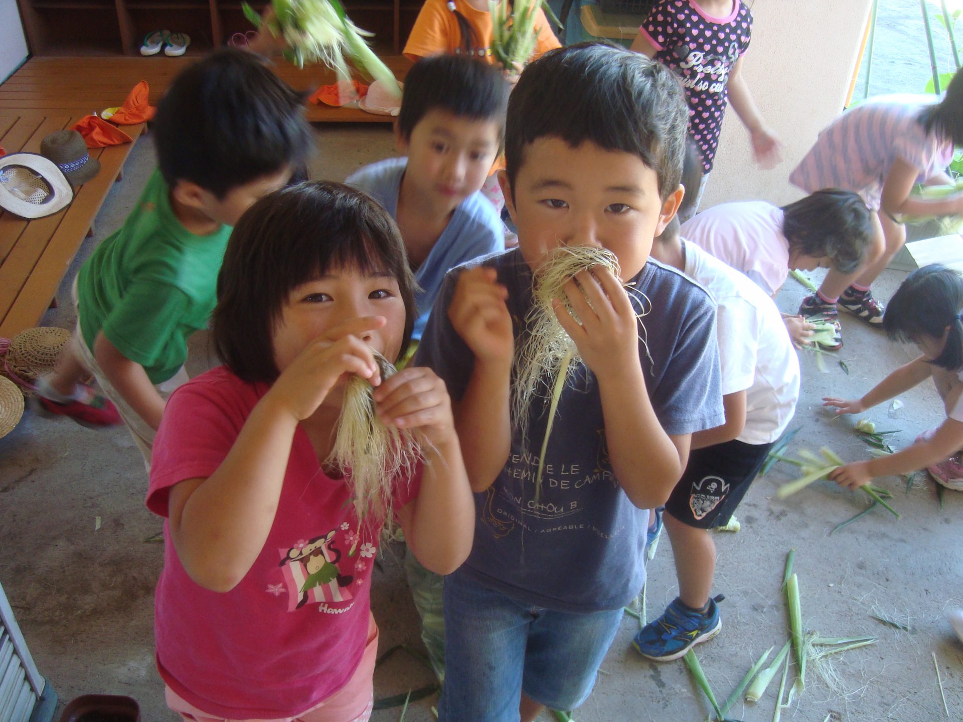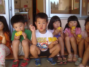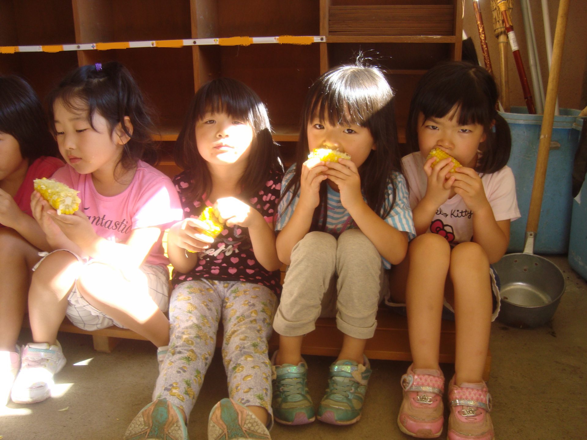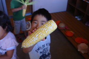 この時期ならではの野菜。そして地元で採れる食材に触れ味わうことで、子ども達には興味関心を持ってもらえたのではと思います。信濃町で採れるとうもろこしの味は、他とは違い一段とあまくて美味しいですよね。これからの時期、またおやつにとうもろこしが出るので子ども達と味わっていきたいと思います。