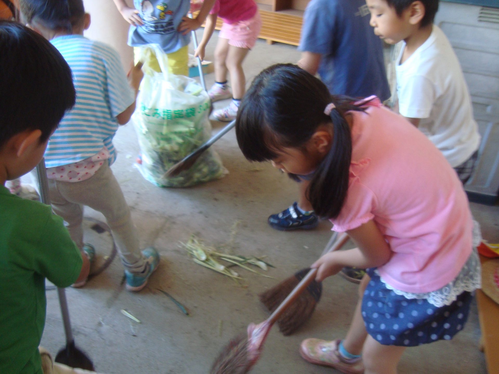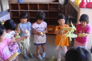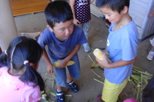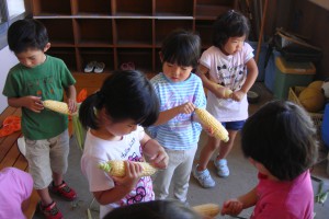 年長さんにとうもろこしの皮むきのお手伝いをしてもらいました。