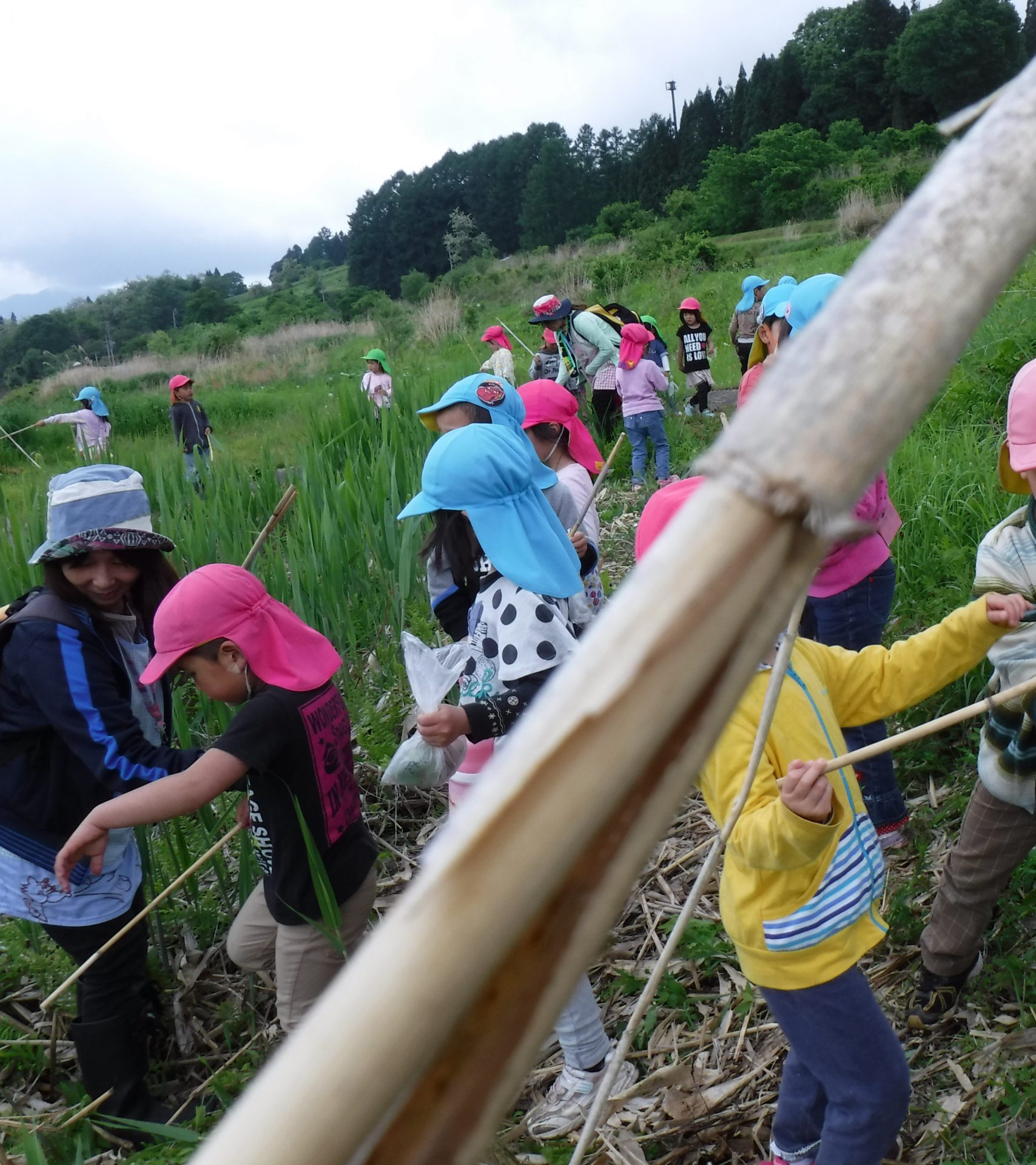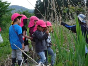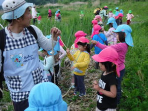 休耕田に葦が茂っているところに来て、保育士が剪定ばさみで枝を切ってくれます。「ぼくのまだ?」