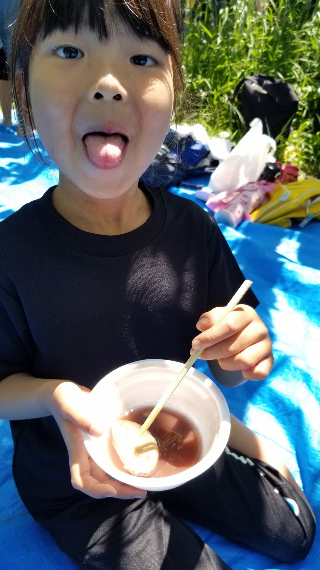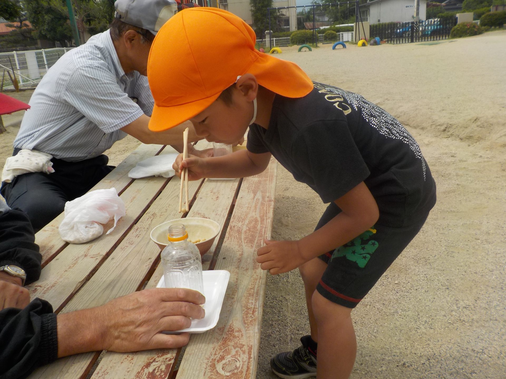 田植えが終わると、地域の人が「そばがき」をごちそうしてくれました。親子でおにぎりを食べて本日は終了しました。