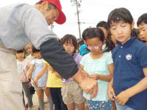 「親指、人差し指、中指の3本で苗を持つんだよ。」と教えてくれました。みんな真剣に聞いてます。