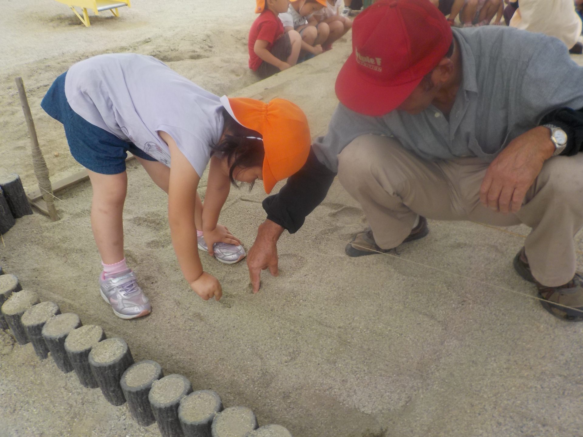 6月2日の田植えに向けて、保育園の砂場で地域の人たちが田植えの講習会をしてくれました。