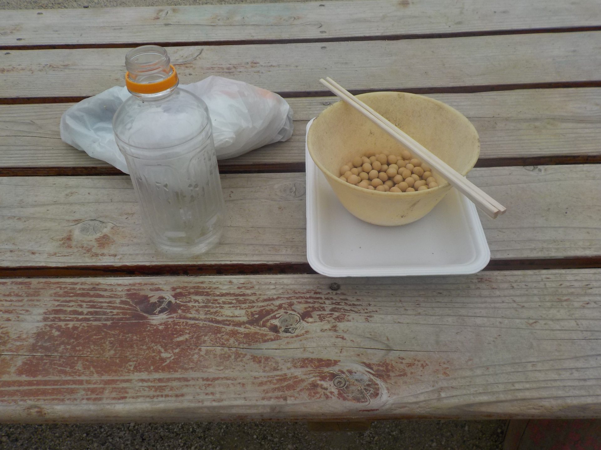 箸を使って大豆をペットボトルにお引越しをするゲームです。