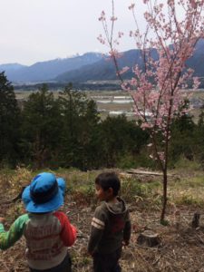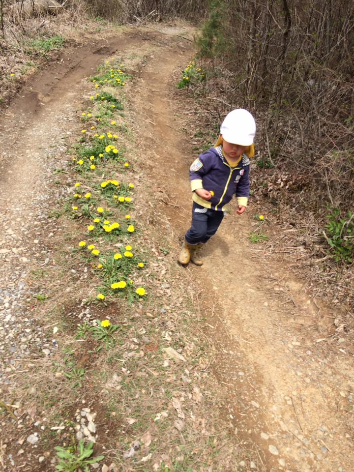 眺望のきく場所に桜の木が花をつけていたところに先にいった人たちがたむろしている。下の風景を眺めたり、桜の周りで走ったり。2歳児もそこまでマイペースで歩き着いた。しばらくみんなでそこで過ごしたが、保育士が帰ろうと声をかけると2歳児以外は走っていってしまった。取り残された2歳児もまた黙々と歩き始めたので、保育士が道端に割いているたんぽぽを摘み「はいどーぞ」と渡すと黙って受け取りまた歩き始めた。
