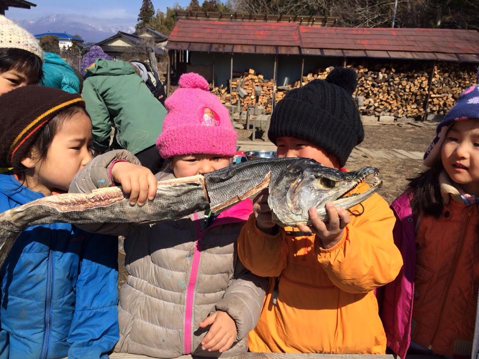 鮭とばになった鮭に包丁を入れる前に、保育士は子どもたちに鮭の顔つきの鋭さや歯の鋭さを見せながら、「だっこしてみる?」と声をかける。子どもたちはかわるがわる手を出して大きな鮭を抱きかかえて、乾燥した後の鮭の手触りや重さのちがいをみようとしている。歯を触ってみてあまりの鋭さに「いたい!」という声も聞かれる。