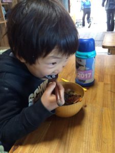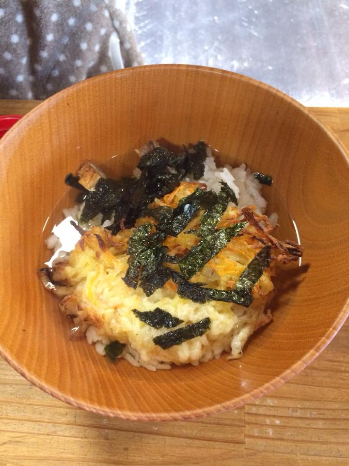 子どもたちが育てたお米を羽釜で炊いて、あぶった鮭とばを白いご飯の上にのせてだし汁をかける。更に野菜のかき揚げと刻みのりトッピングしていただいた。
