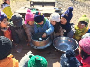海から川へ傷ついた体で力を振り絞って遡上する鮭の姿を実際に目にした年長児たち。帰る際には来ていない人たちのためにと譲ってもらった鮭を抱きかかえて、「おもたい!」と言いながらも力を合わせて車まで運んできた。