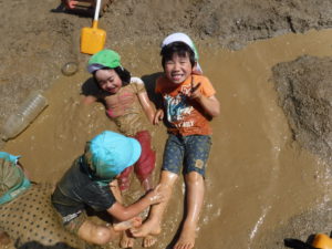 泥んこで形つくりアートを楽しむ子、全身を泥だらけにしながら温泉作りを楽しむ子と楽しみ方は様々!