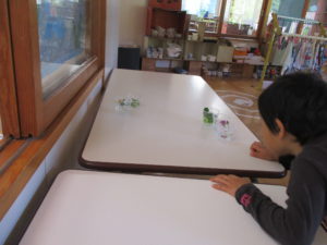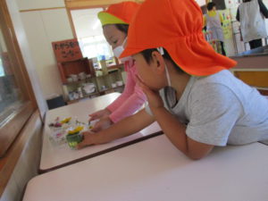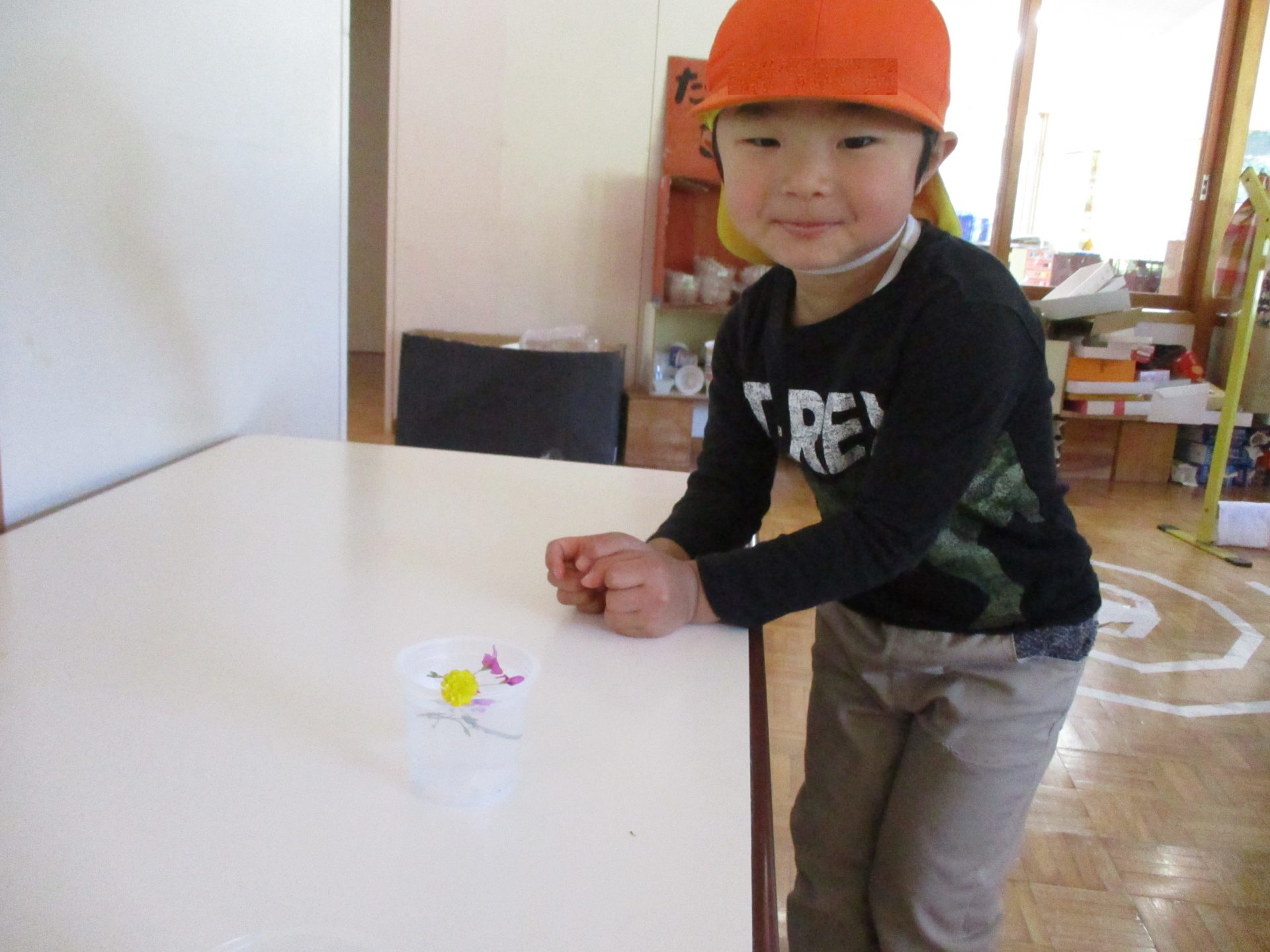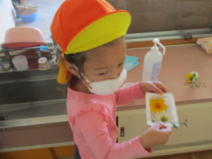 園庭や散歩に出かけると、草花に興味をもつ女の子。お部屋に戻ると早速、宝物コーナーから今日の花瓶を見つけます。「かなへびさんに、見せてあげようかな」「お家の人に見せたいから、靴のところ(下駄箱)がいいな」と、草花を見つけた後も、大事にしている姿がありました。「机に並べたら、どうかな?」という声に、みんなで園庭へ駆け出していきました。