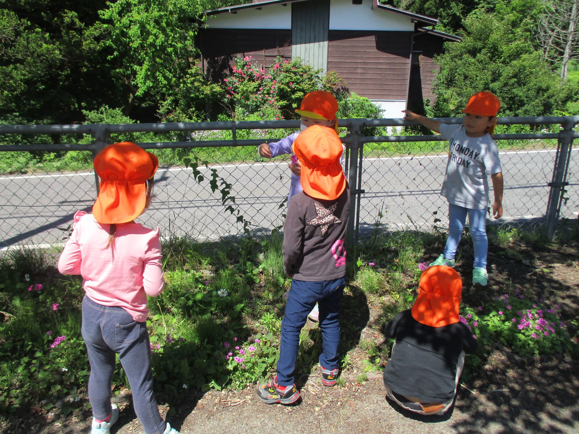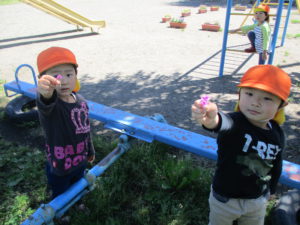 「私も、飾りたいなー!!」「ピンクのお花は、どうかな?」早速、園庭に向かって走って行きました。