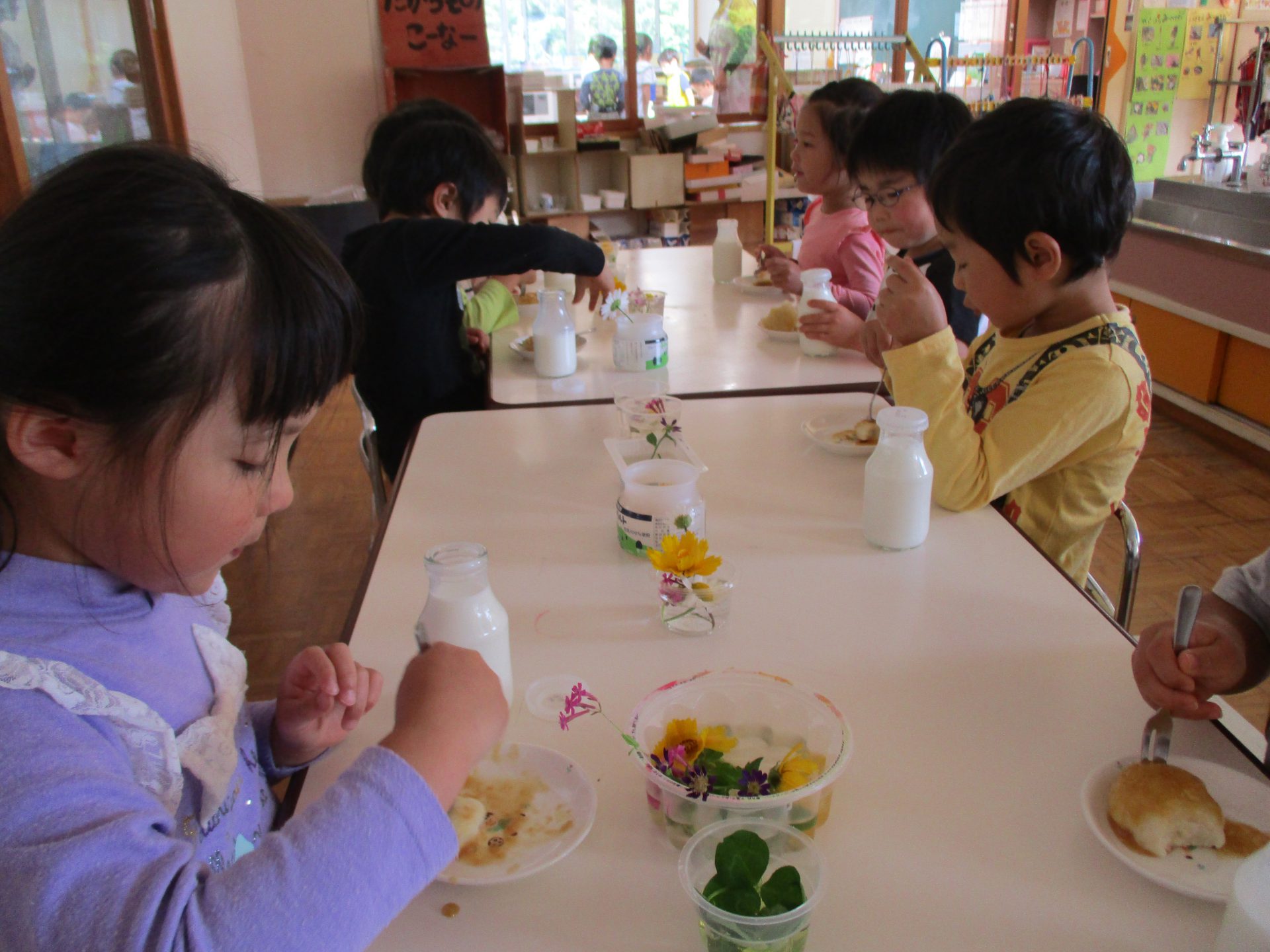 「お花さん、僕のおやつのところまで来ちゃった。お花さん、僕の食べるところ見ててね」