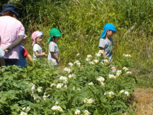 ・「メイクイーンの花は紫色、男爵は白い花だよ。」「どちらも真ん中に黄色いね。」テントウムシを見つけ、「ジャガイモの葉っぱを食べる悪いテントウムシじゃない?」JAの宮崎さんが、この花が枯れるころになるとジャガイモが収穫できるよ。」と教えてくれました。