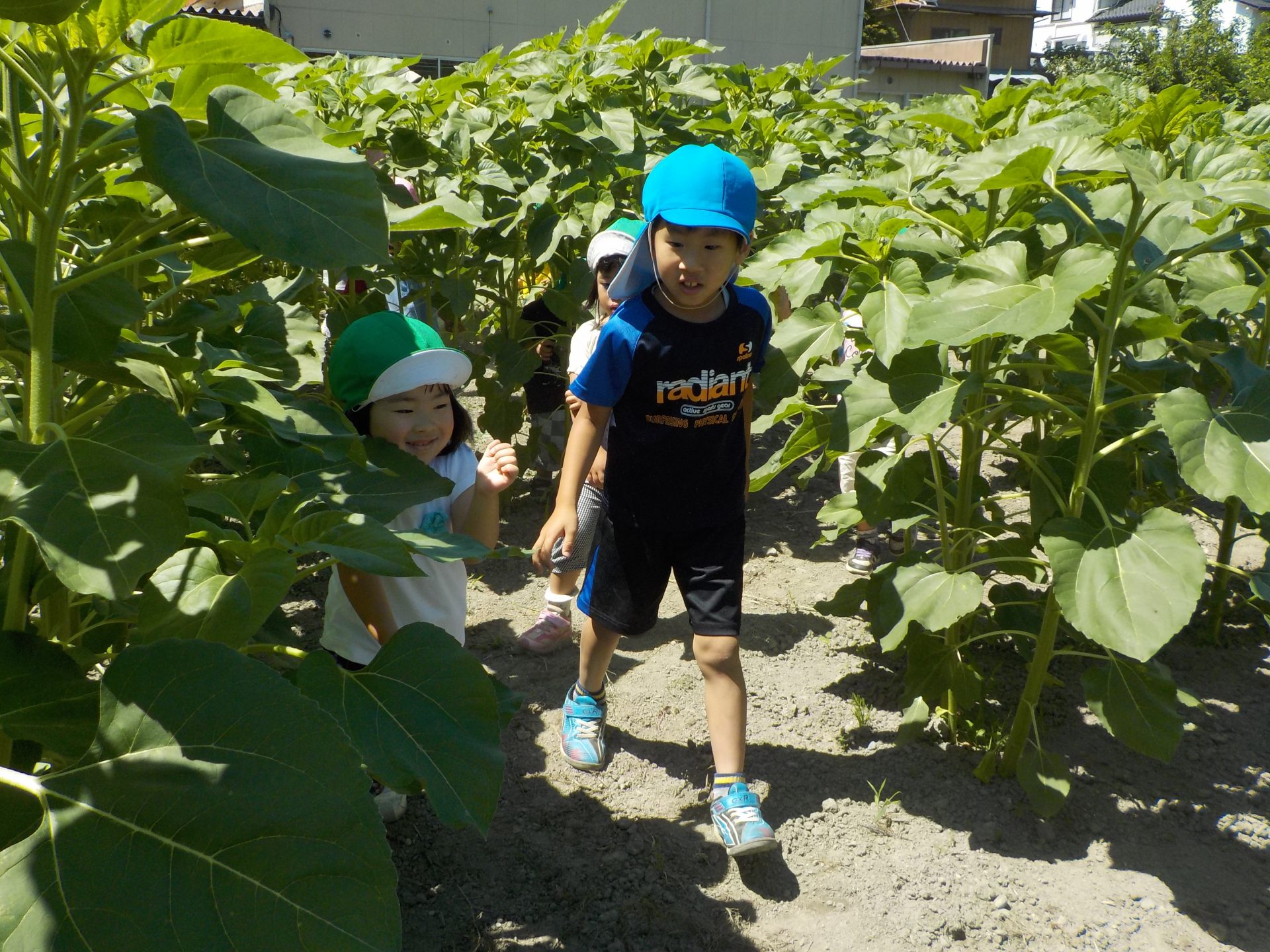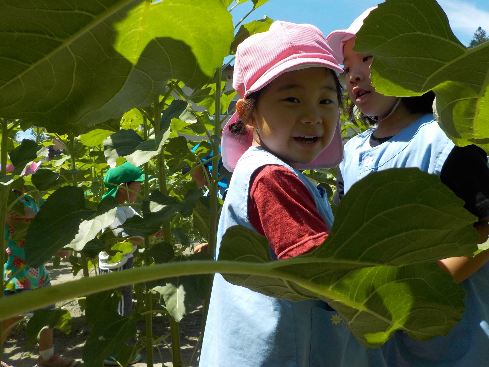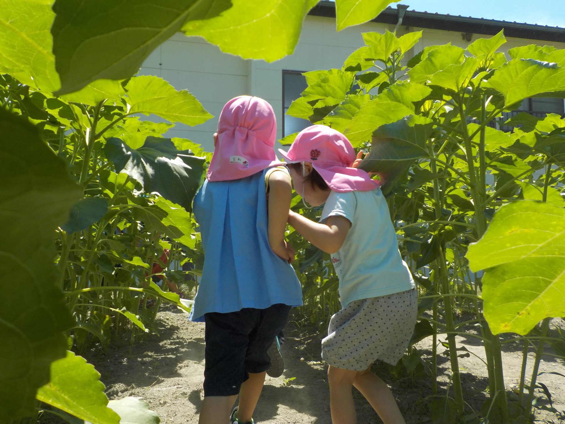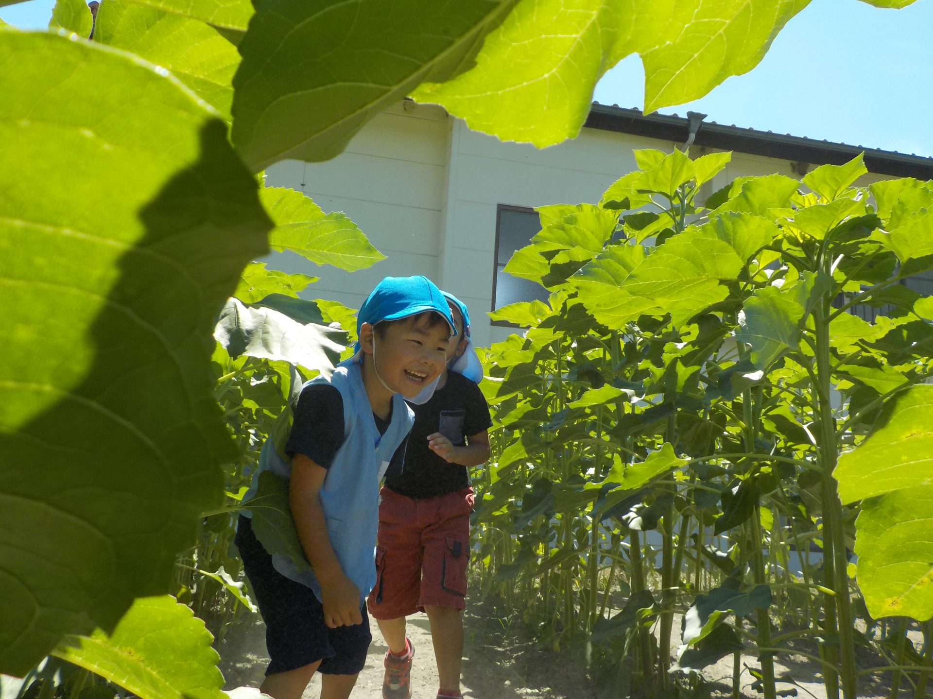 ・迷路の形に種まきをして、前回見に行った時はまだ小さな芽だったひまわりの苗が、大きく成長して子どもたちはびっくりしたり喜んだり。JAの方も「こんなに喜んでくれるとは思わなかったなー。」と言って笑っていました。こまめにお世話をしてくださって感謝です。ひまわりの生長や特徴にも気づくことが出来、花が咲くのを楽しみにしているこどもたちです。