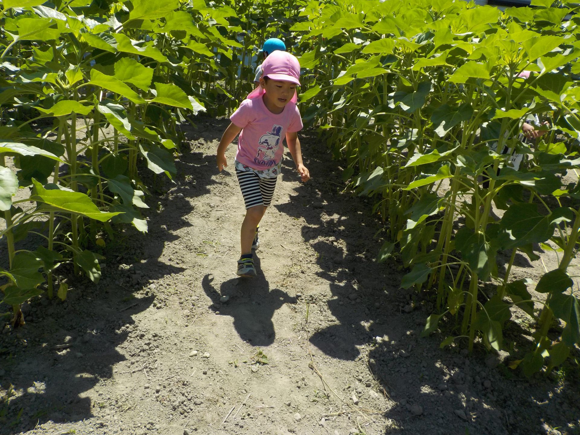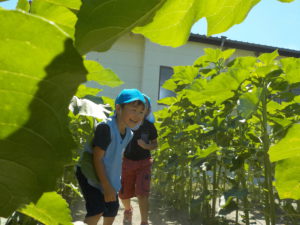 その隣に、子どもたちがが種をまいたひまわり畑があります。ひまわりは子どもたちの背丈を超すくらいに伸びて、迷路の形が出来ていました。