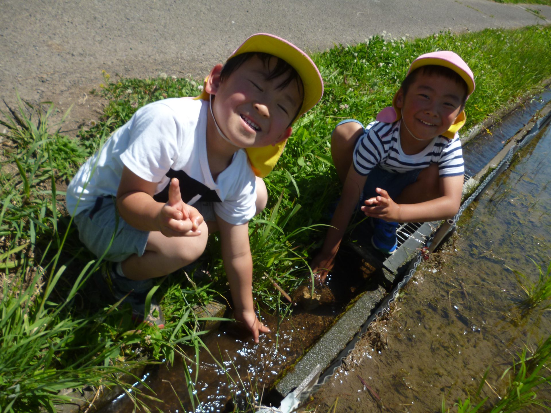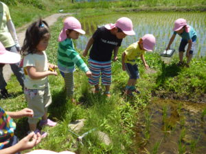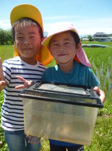 「おたまじゃくしゲットしたよ」「保育園にかえったら発砲スチロールの田んぼに放すんだ」