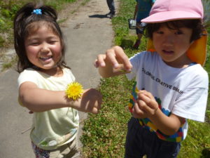 みんな満面の笑みでこの様に遊べるなんて幸せだと思います。いつの間にか子どもたちだけでたんぽぽのブレスレットを作れるようになりました。
