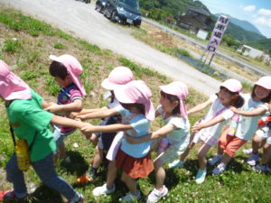 散歩からの帰り道、みんなでつながっていこう!仲良しのたいよう組のみんなです。