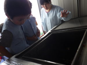 給食で出る野菜の皮やヘタなどを入れて混ぜて堆肥を作っていることを知り、