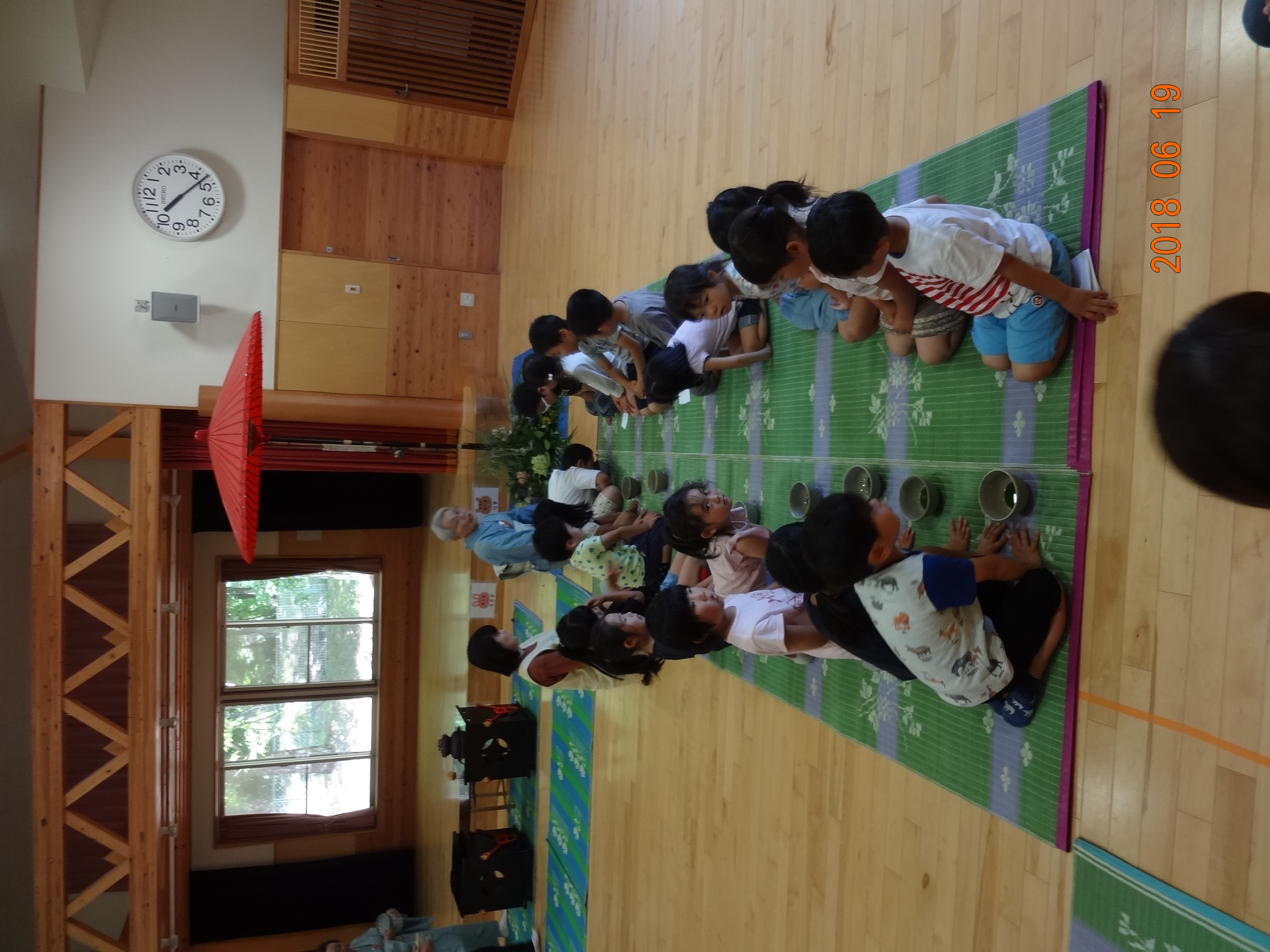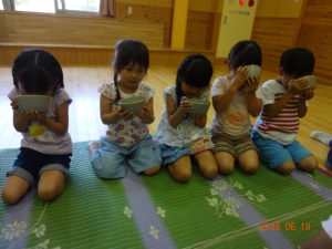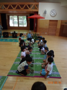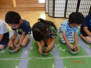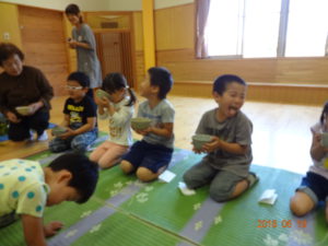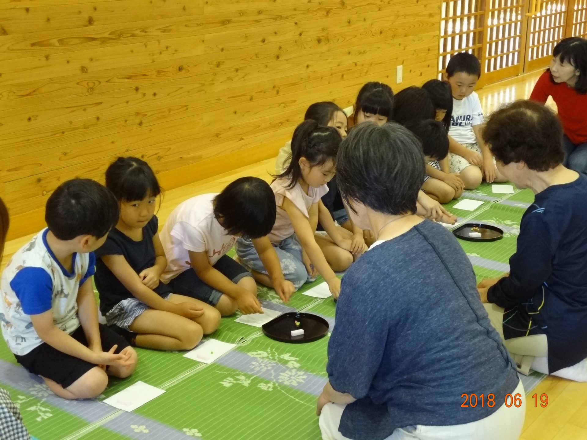 お茶の前にお菓子を頂きます。「お菓子をどうぞ。」となりの人に「おさきに」「どうぞ」と挨拶をして、かえしを出しお菓子に感謝をします。かえしにお菓子をのせたら、となりのお友達へ渡します。みんなで一緒に「いただきます」をして食べます。「おいしい」とても緊張している年長さんです。
