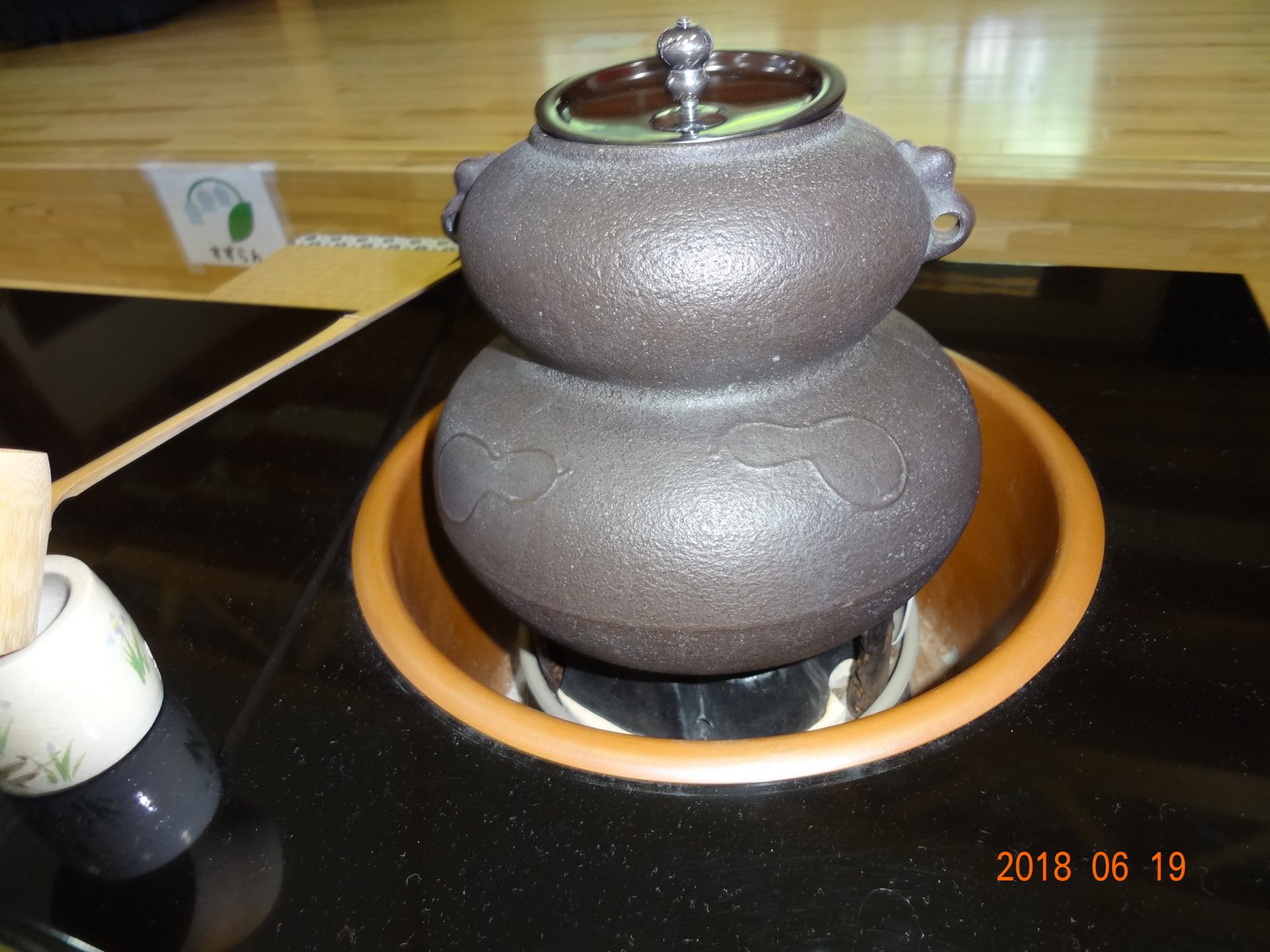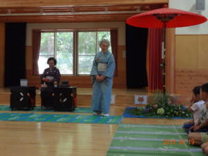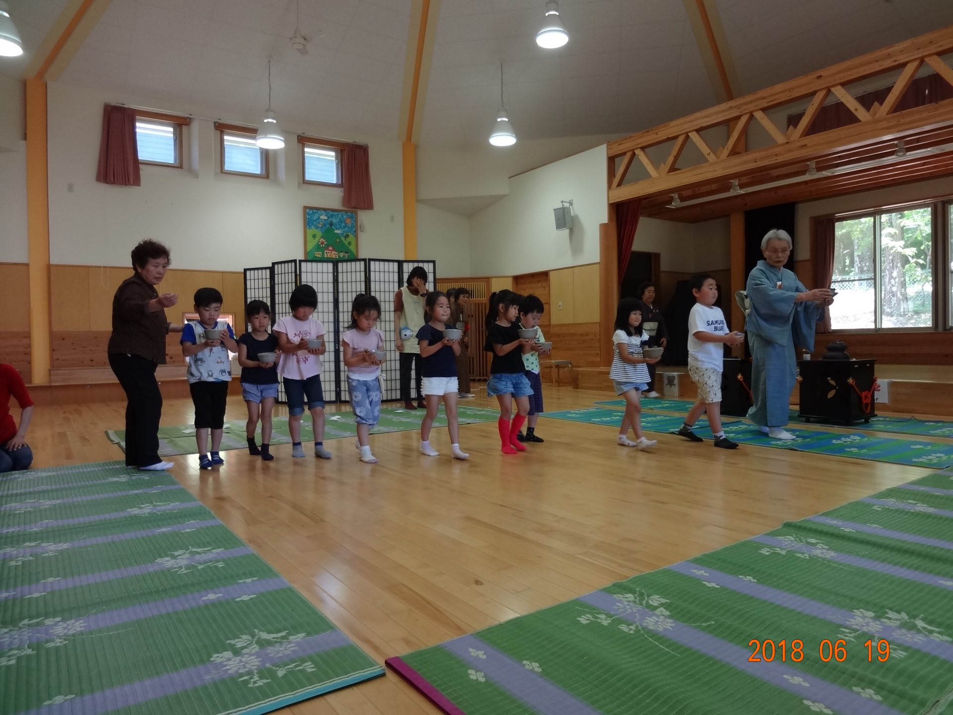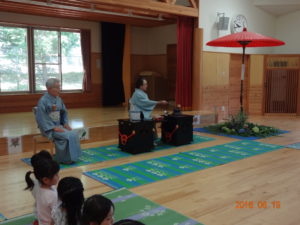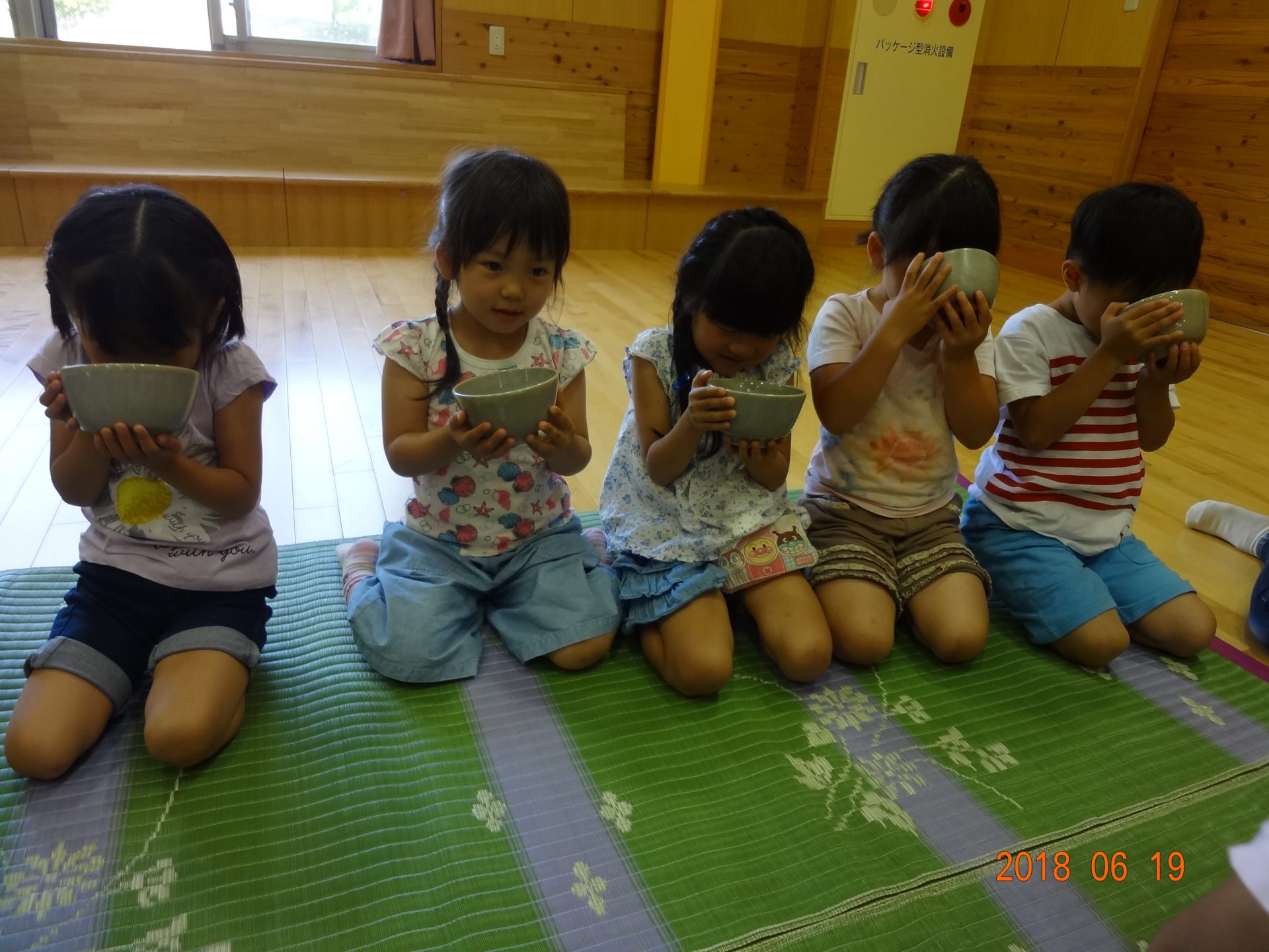 お茶の前にお菓子を頂きます。「お菓子をどうぞ。」となりの人に「おさきに」「どうぞ」と挨拶をして、かえしを出しお菓子に感謝をします。かえしにお菓子をのせたら、となりのお友達へ渡します。みんなで一緒に「いただきます」をして食べます。「おいしい」とても緊張している年長さんです。