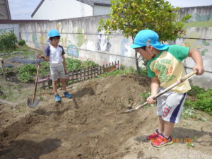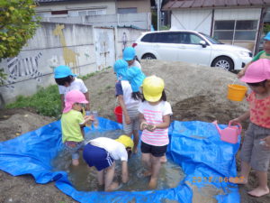 ・穴を掘ったけど水が溜まるかなあ。なくならないようにビニール敷いて!すごい!水が減っていかない!