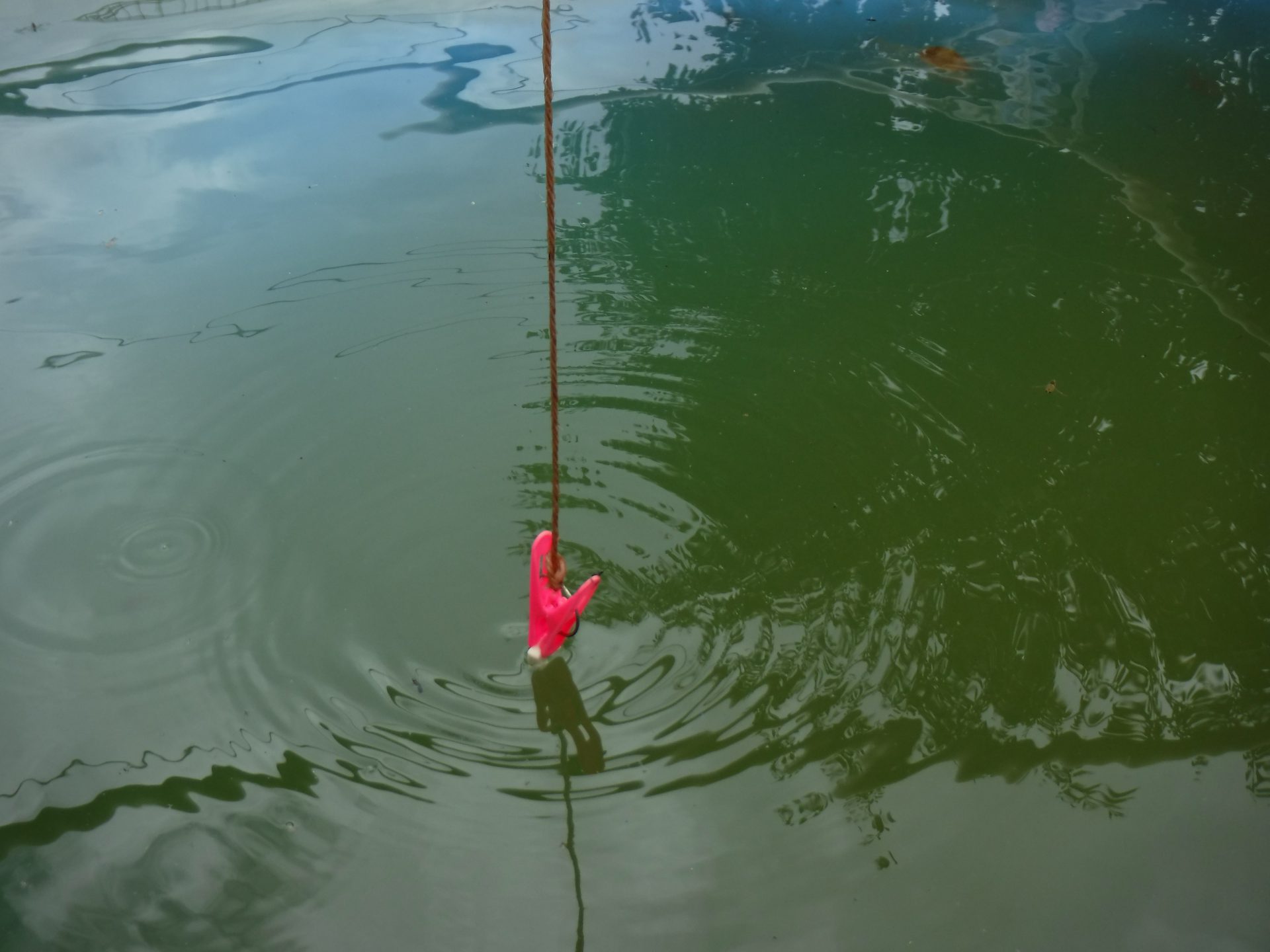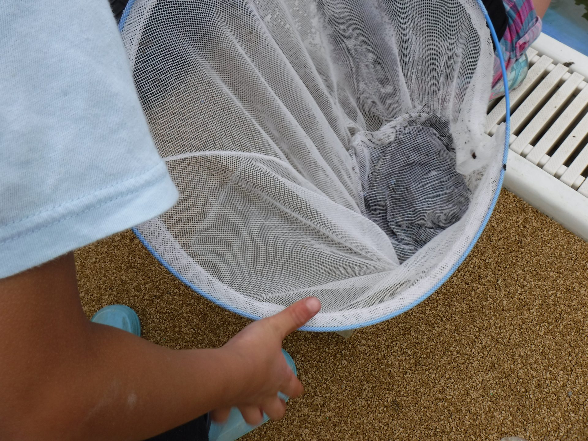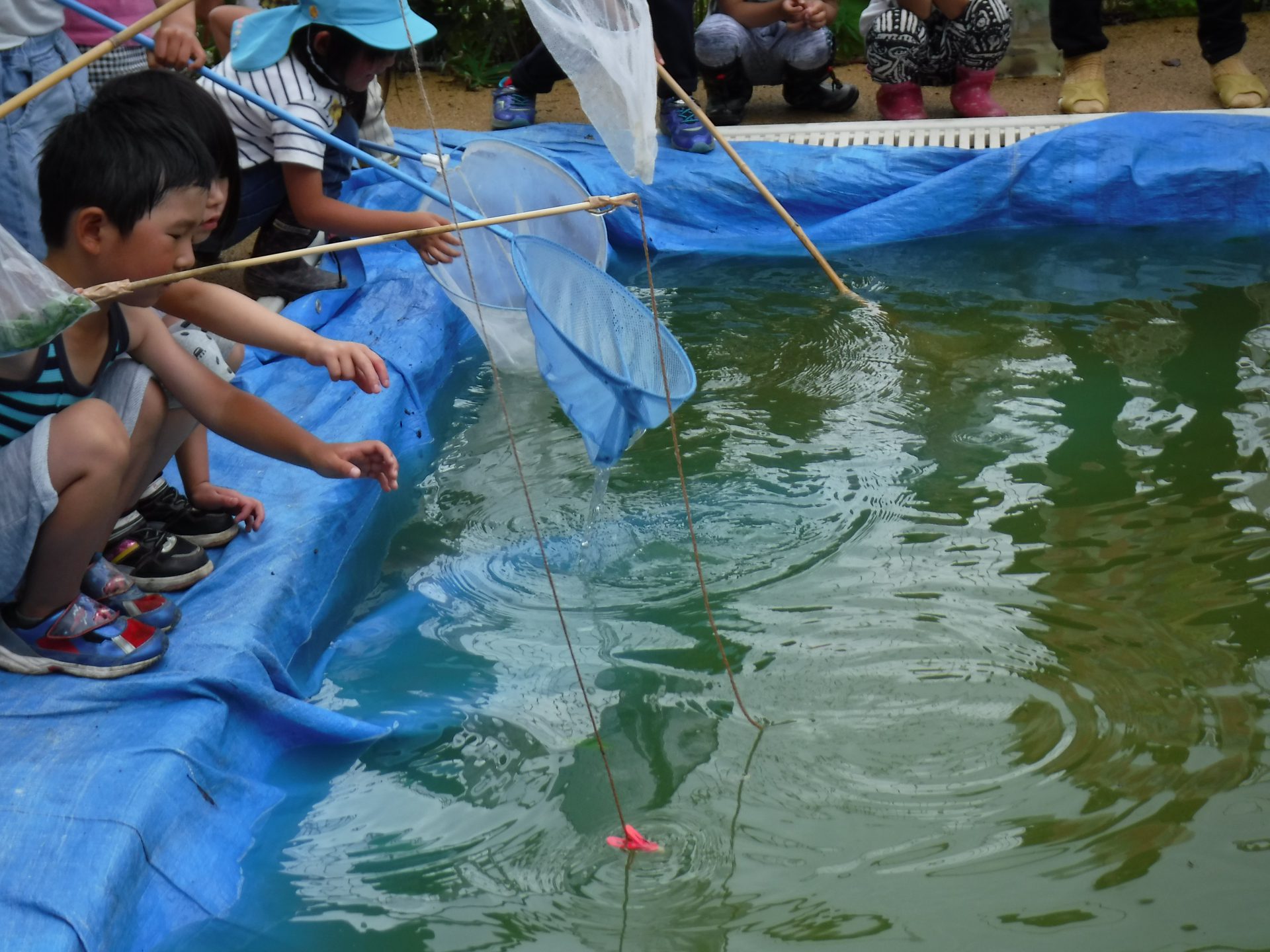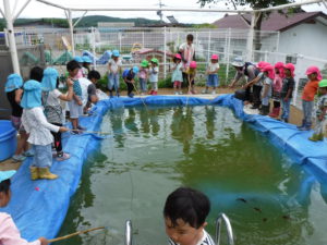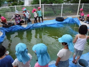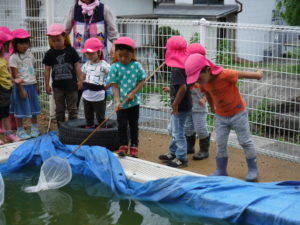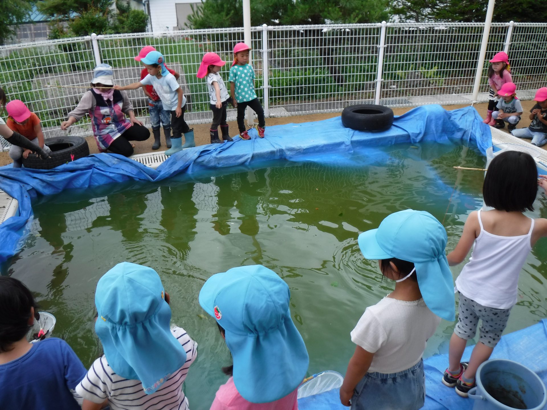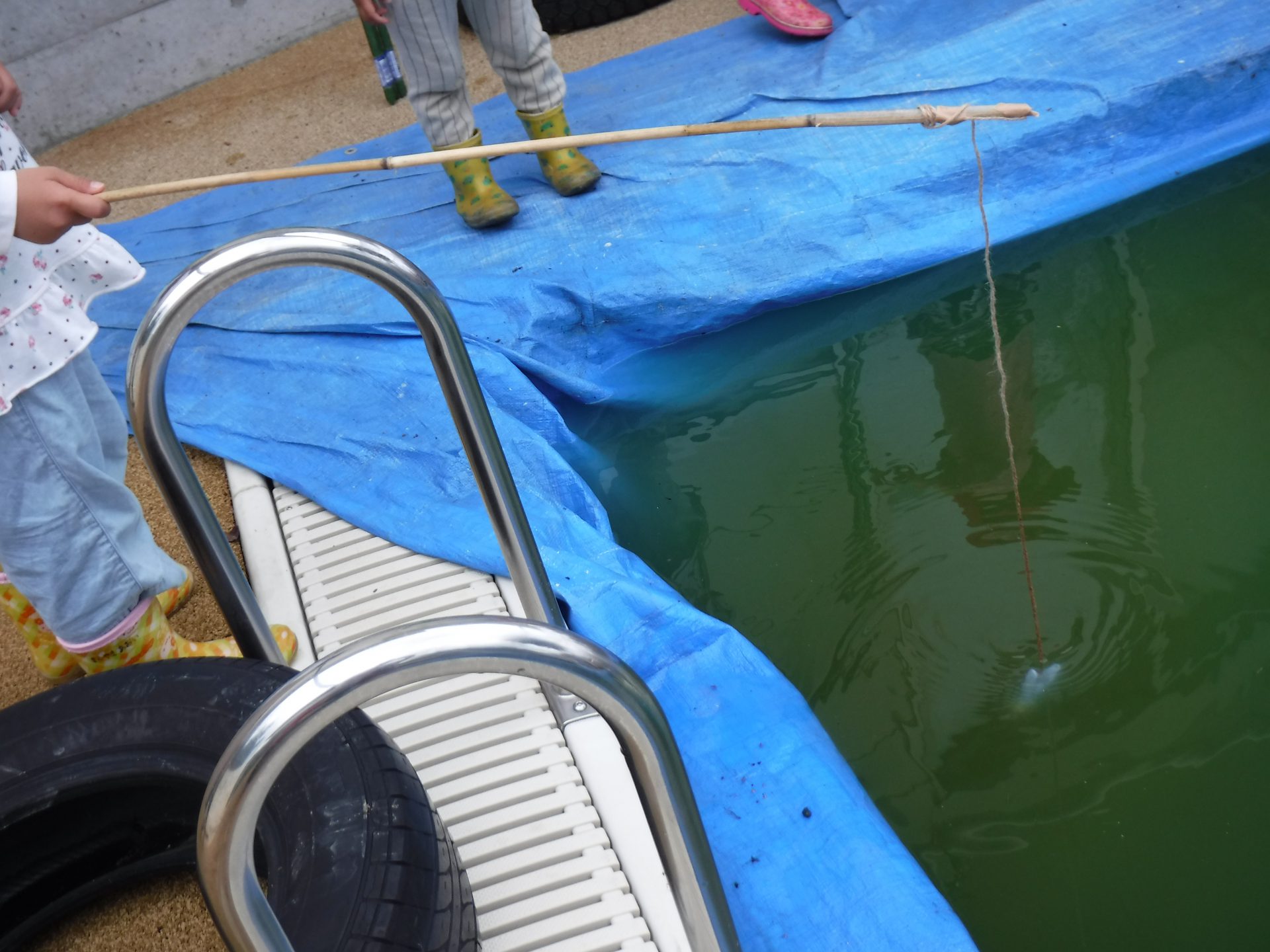 夏の前の汚れたプールですが、見方を変えれば楽しい釣り堀に!