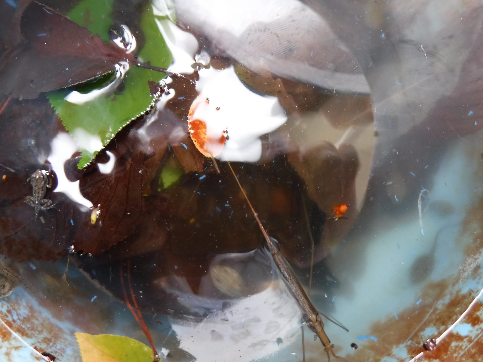 堆積した落ち葉と一緒に、オタマやミズカマキリが!