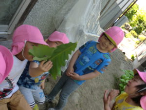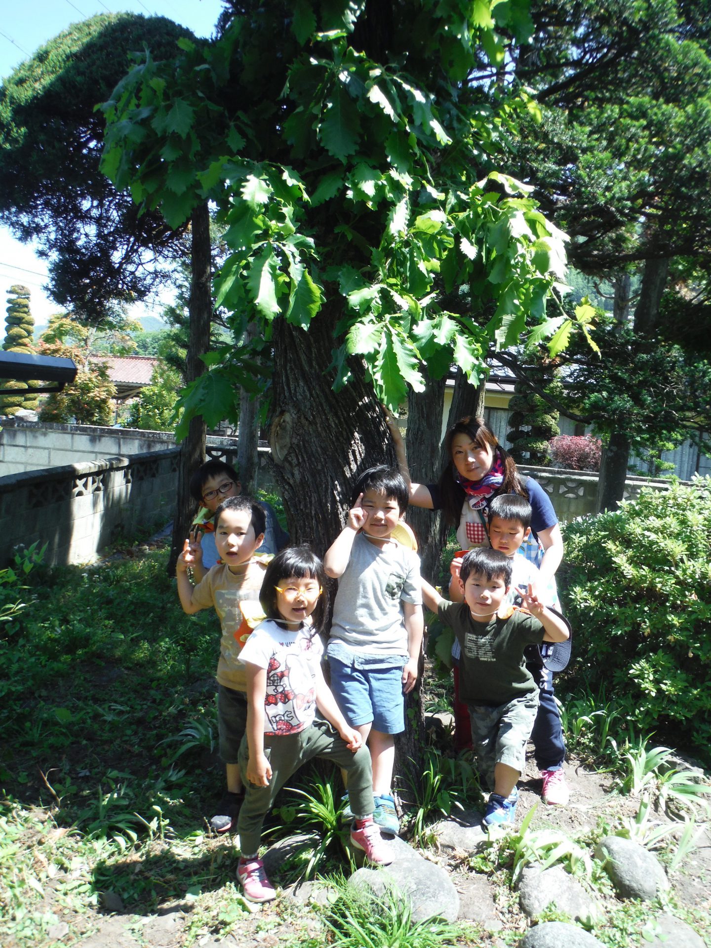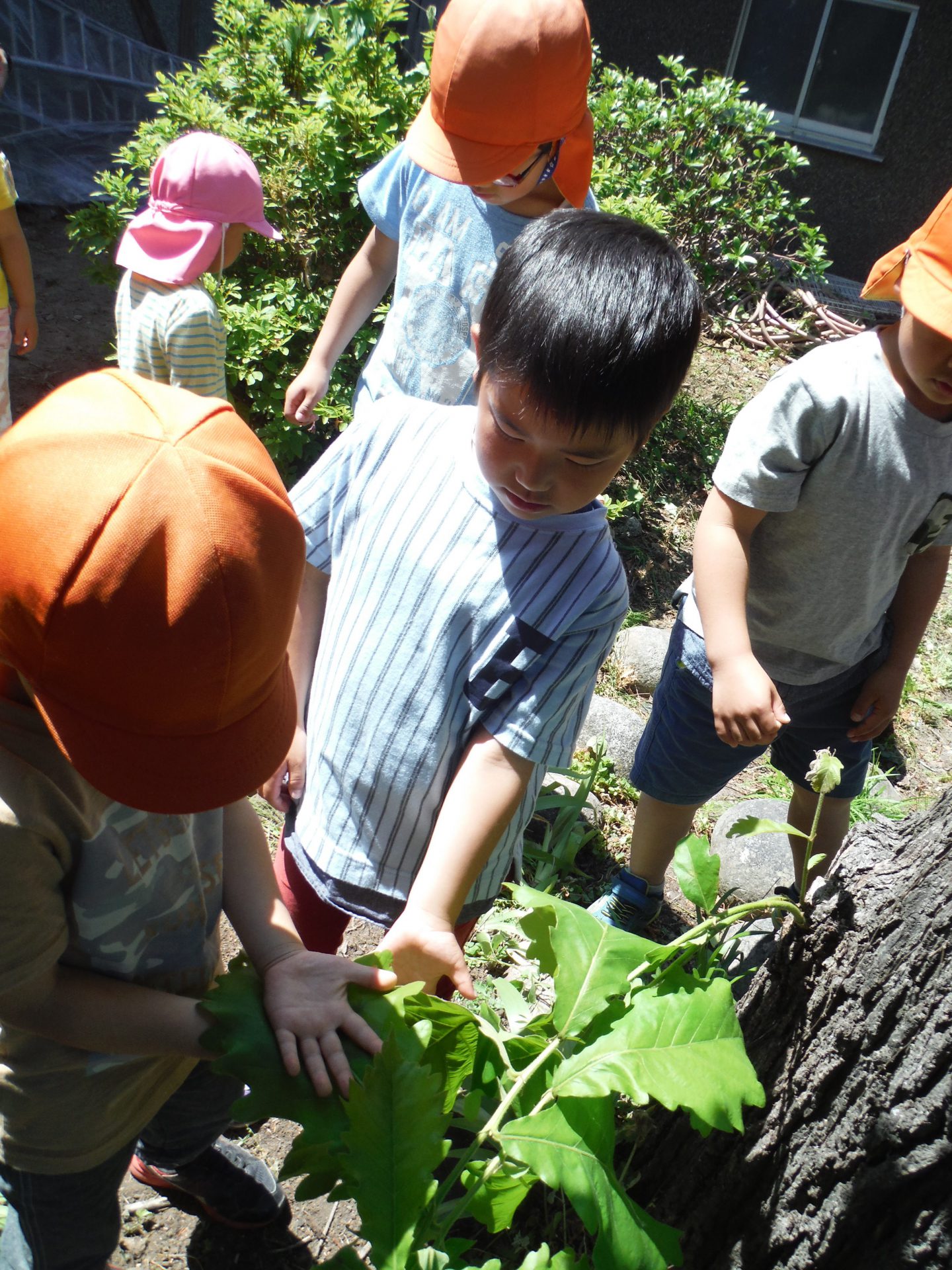子どもの日にあわせて、柏餅づくりをしたことにちなみ、その時に使った柏の葉は、いったいどんな木にできているのか、地域の方のお家へ見せてもらいに行きました。