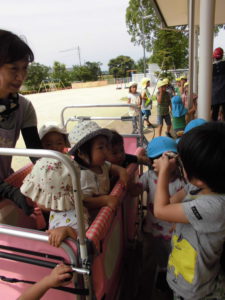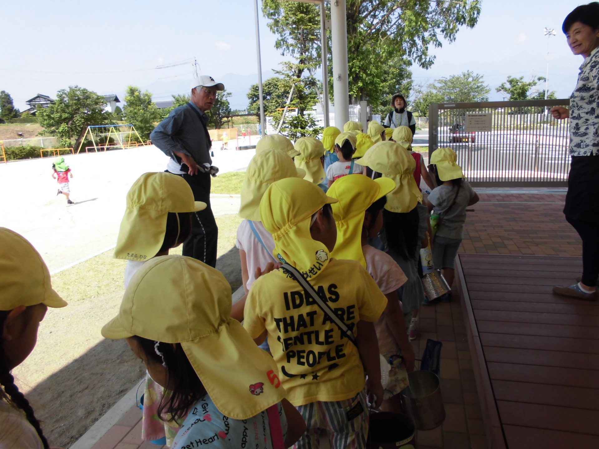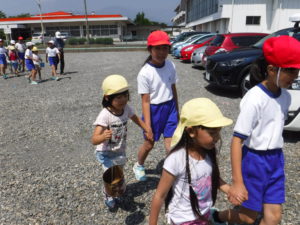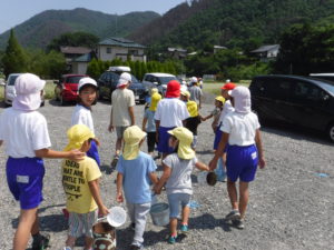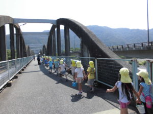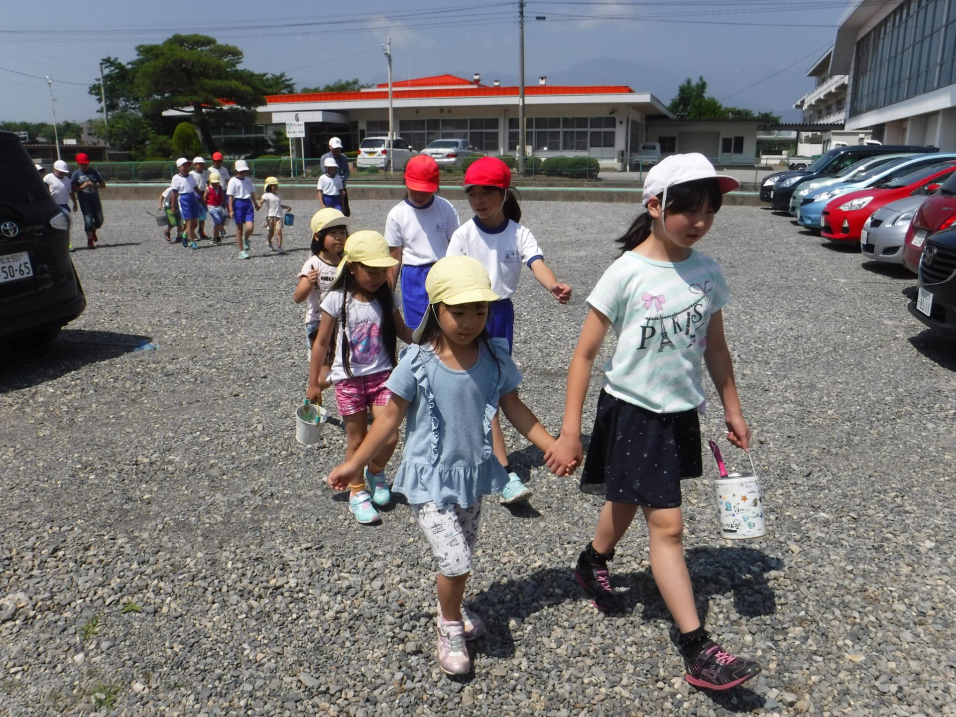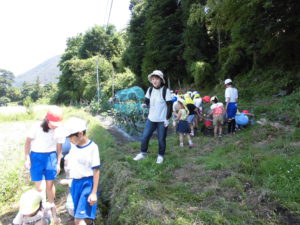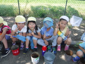 暑い中の散歩となったが、事前にカニを見たり、おうちの方に協力してもら、網やおたまなどを持ってきてもらったことで、当日をとても楽しみに待つことができた。