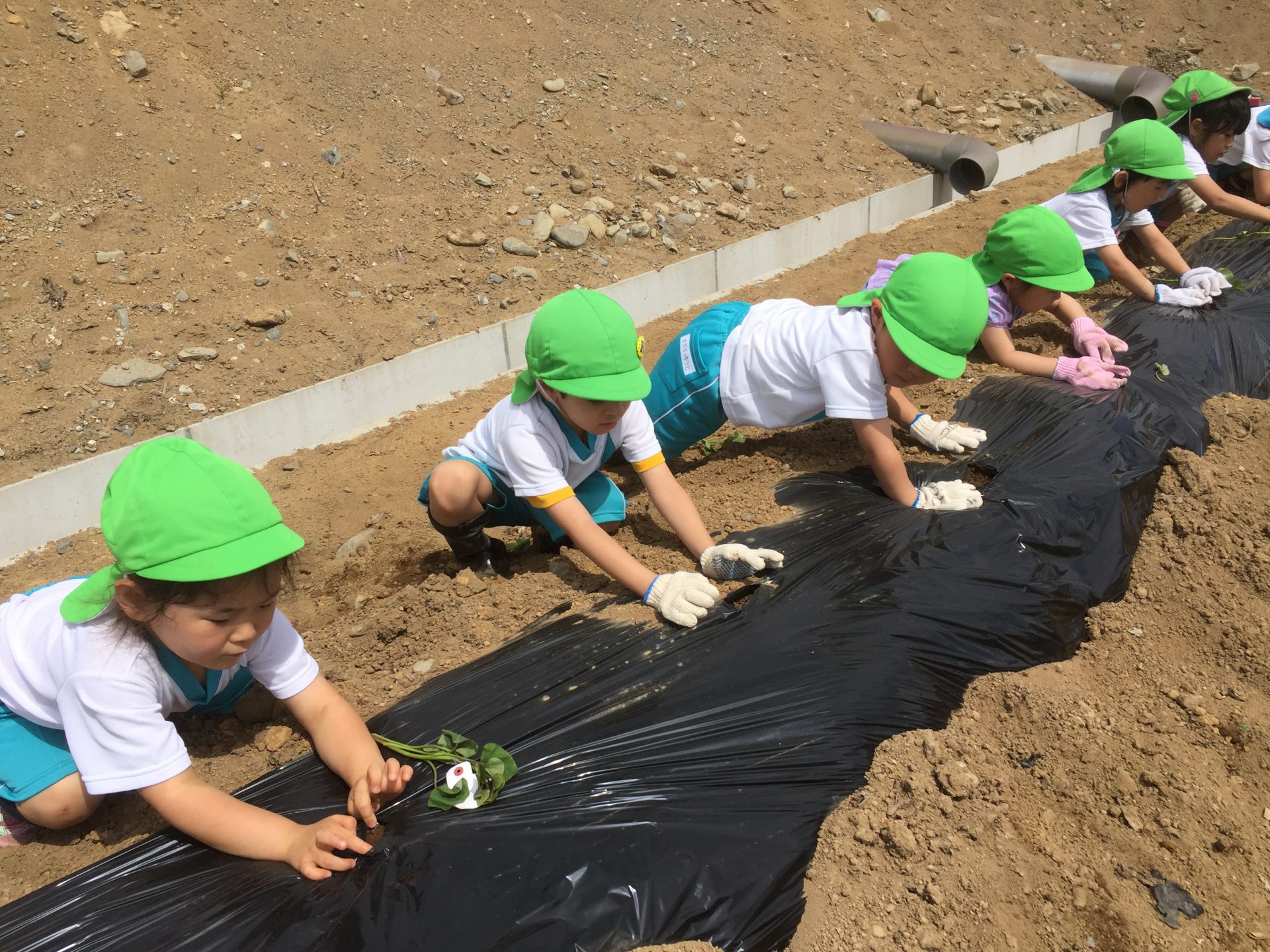 マルチの中の土と外の土の温かさを比べたり、実際に苗を植える大変さや楽しさを味わったりする。
