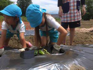 「あったかい」「お風呂みたい」「あっつい!!」と、マルチの外の土とは温かさがまったく違うことを感じていました。