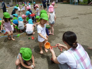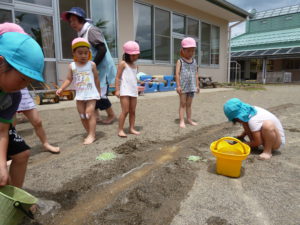 水遊びをしている園庭からは、面白そうな笑い声、叫び声。