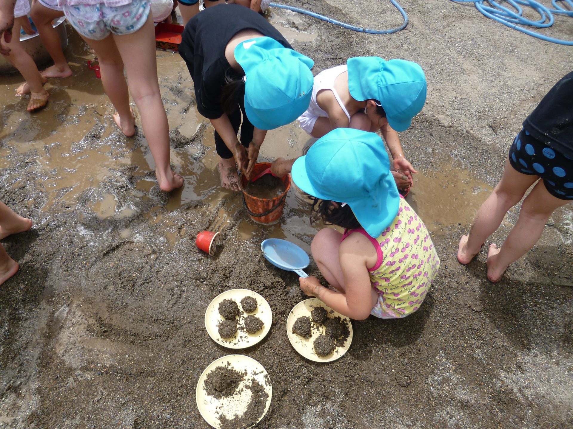 砂場の砂ではできにくいお団子も、泥んこになれば思い通りにできちゃいます。