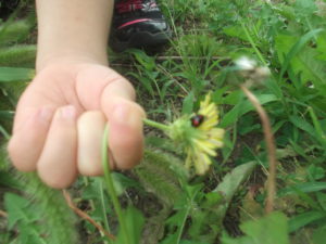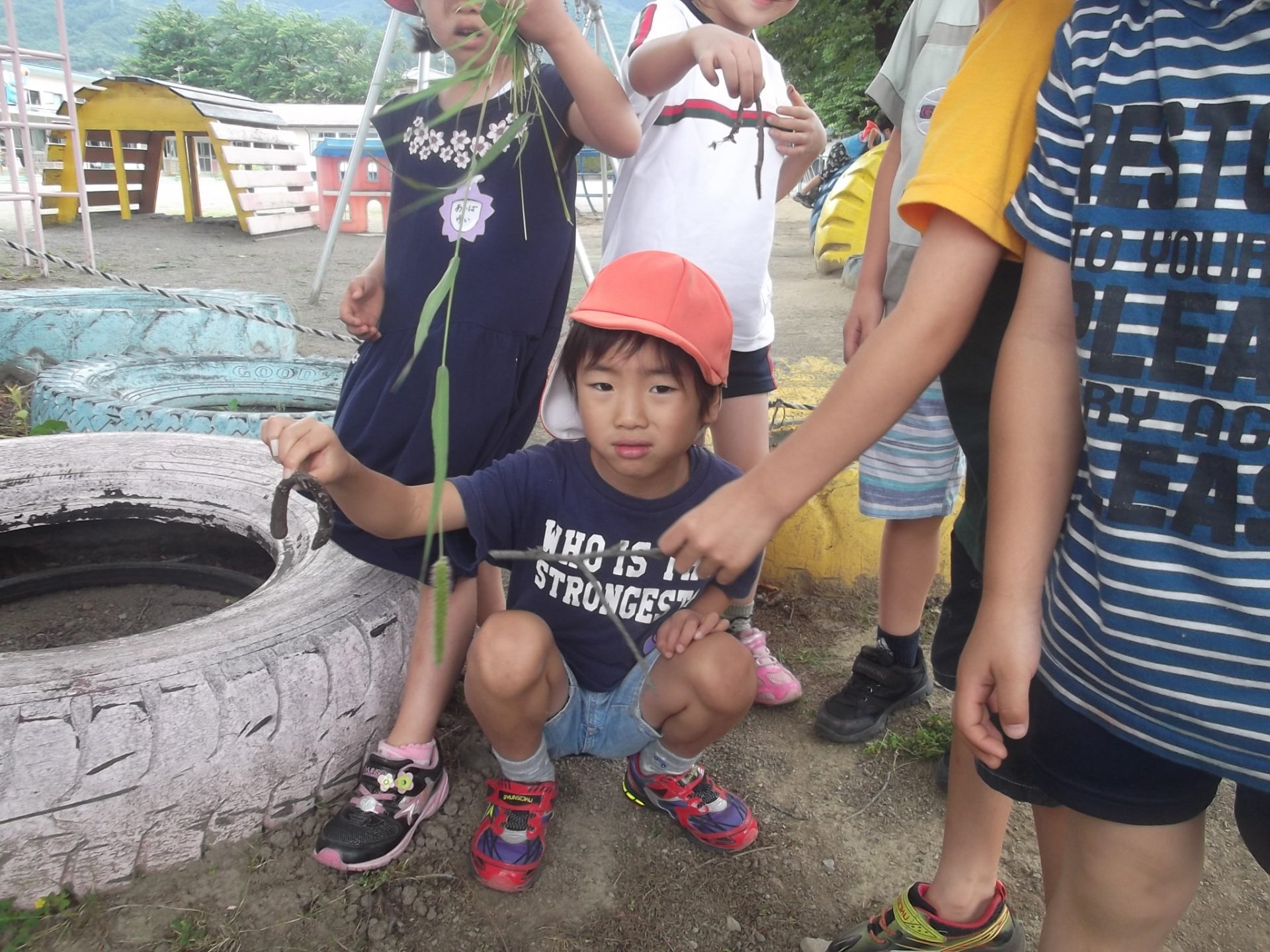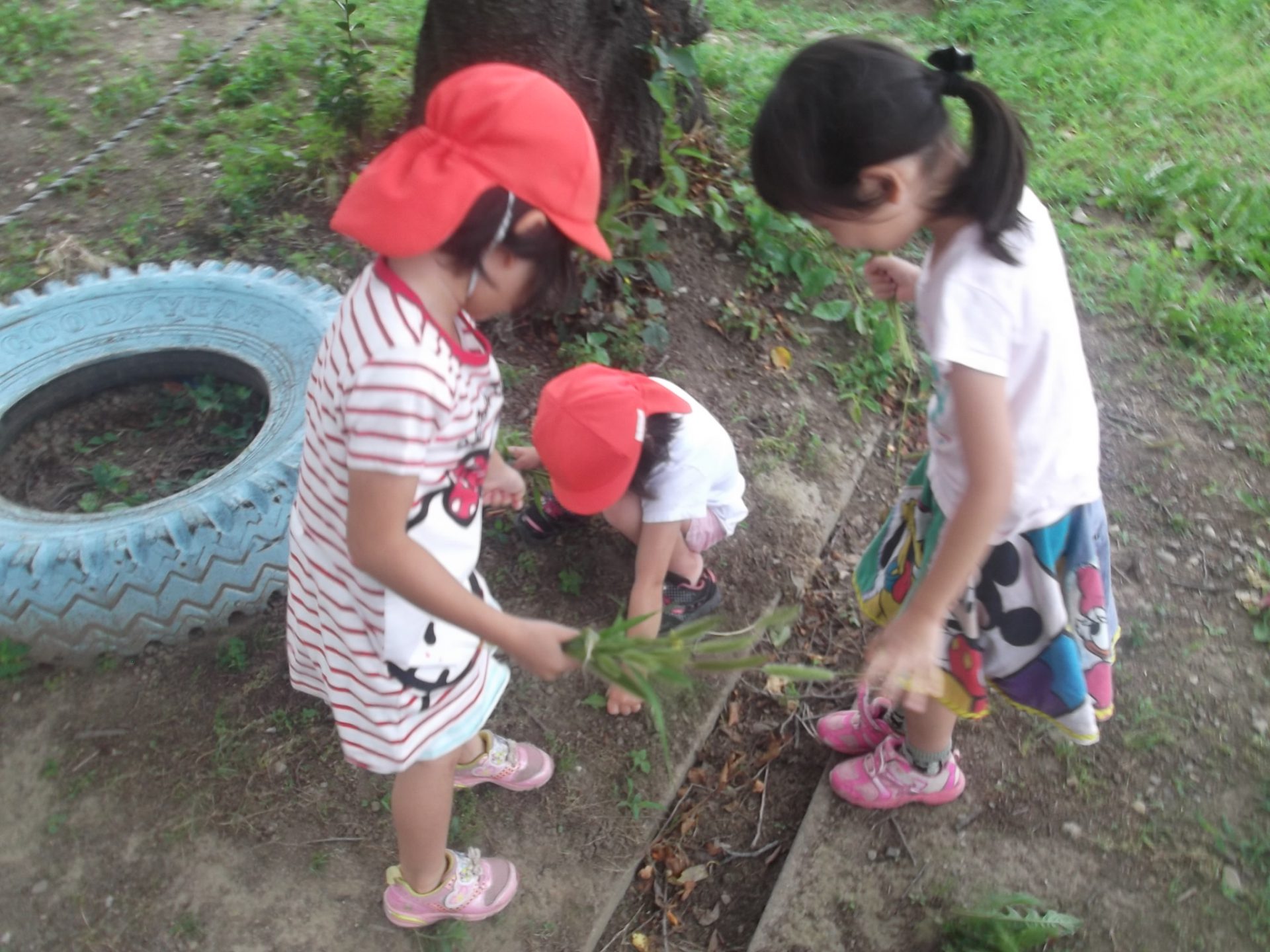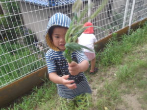 ねこじゃらし取りから、草取り、ミミズ探しと活動が移っていきましたが、子ども達と遊びながら活動が変化し、草取りも遊びの延長のように楽しめているなど、子ども達って柔軟で純粋で、いいなあと思いました。日々の行事に追われ、野菜のお世話もなかなかできずにいたのですが、また今回の出来事をきっかけに野菜の成長を気にかけてくれるといいなあとも思います。