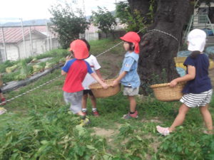 ここは幼稚園の畑ですが、ちょっと見ない間に草がぼうぼうになっていました。そこで、皆で草取りをしました。かごいっぱいに草を取っていきます。