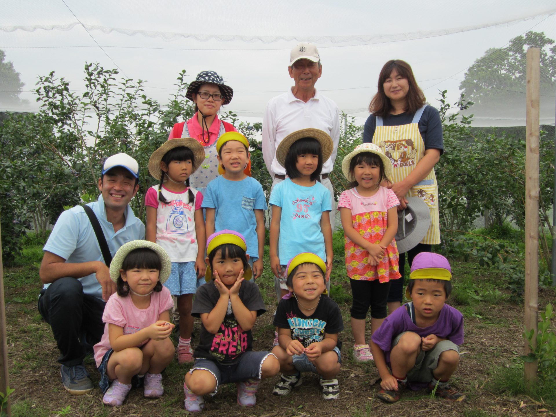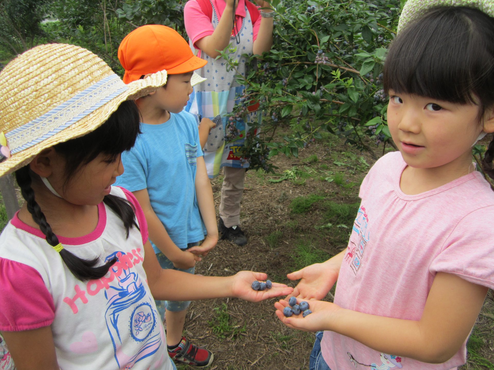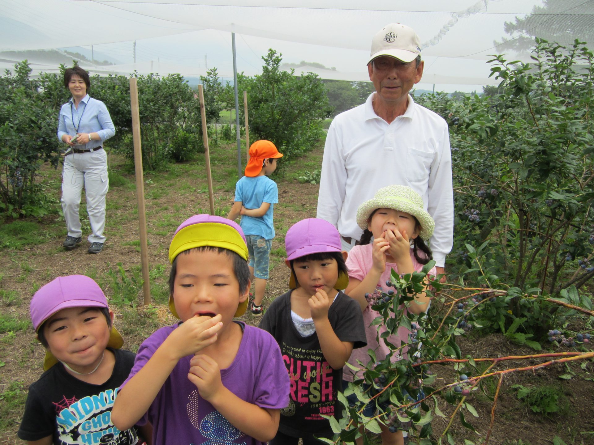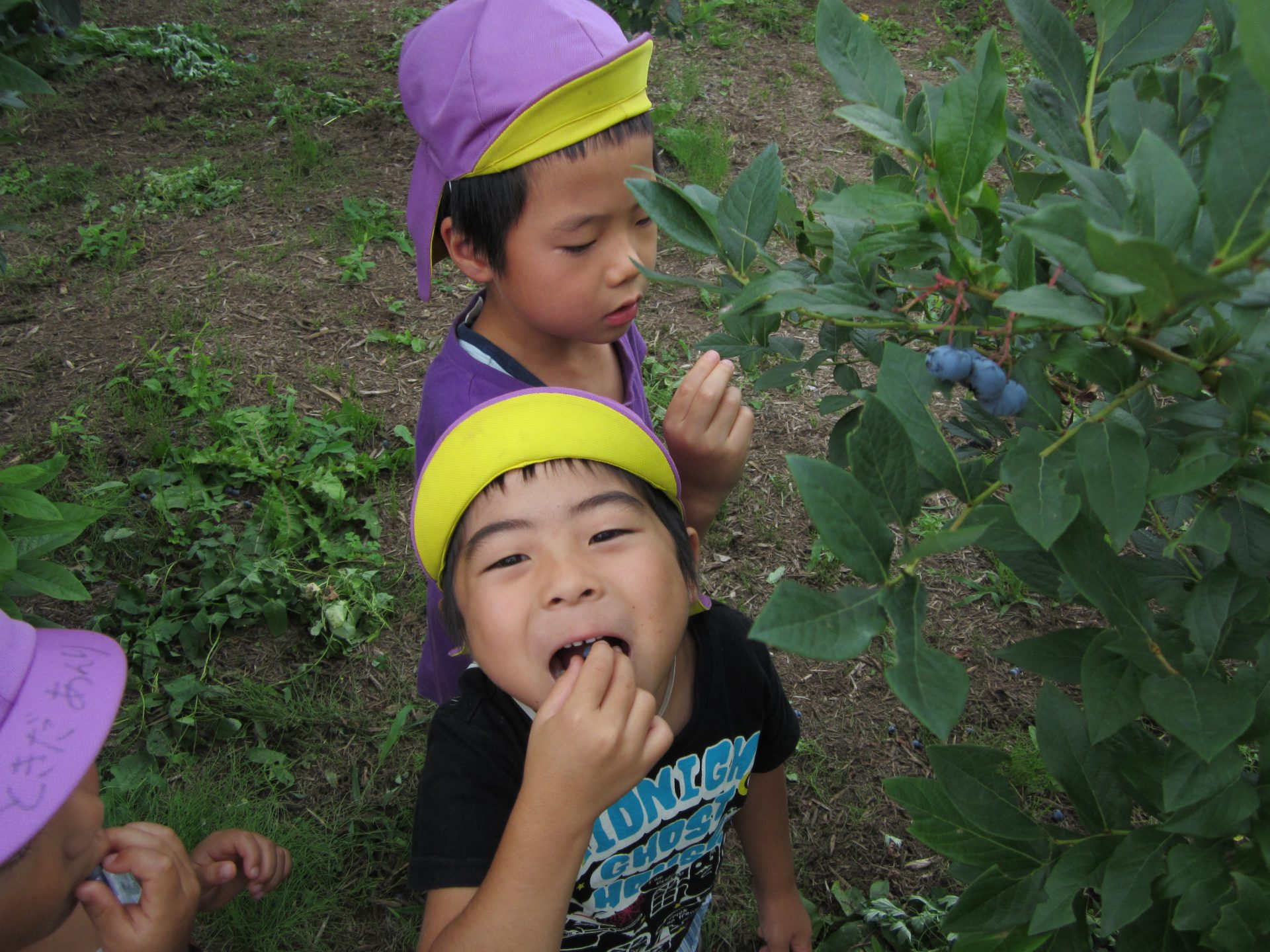 信濃町ブルーベリー栽培研究会にご招待いただき、富士里地区のKAWASUNブルーベリー農園さんに年長児が行ってきました。今年は富士里保育園のお友達と一緒にブルーベリーの摘み取り体験をさせてもらいました。