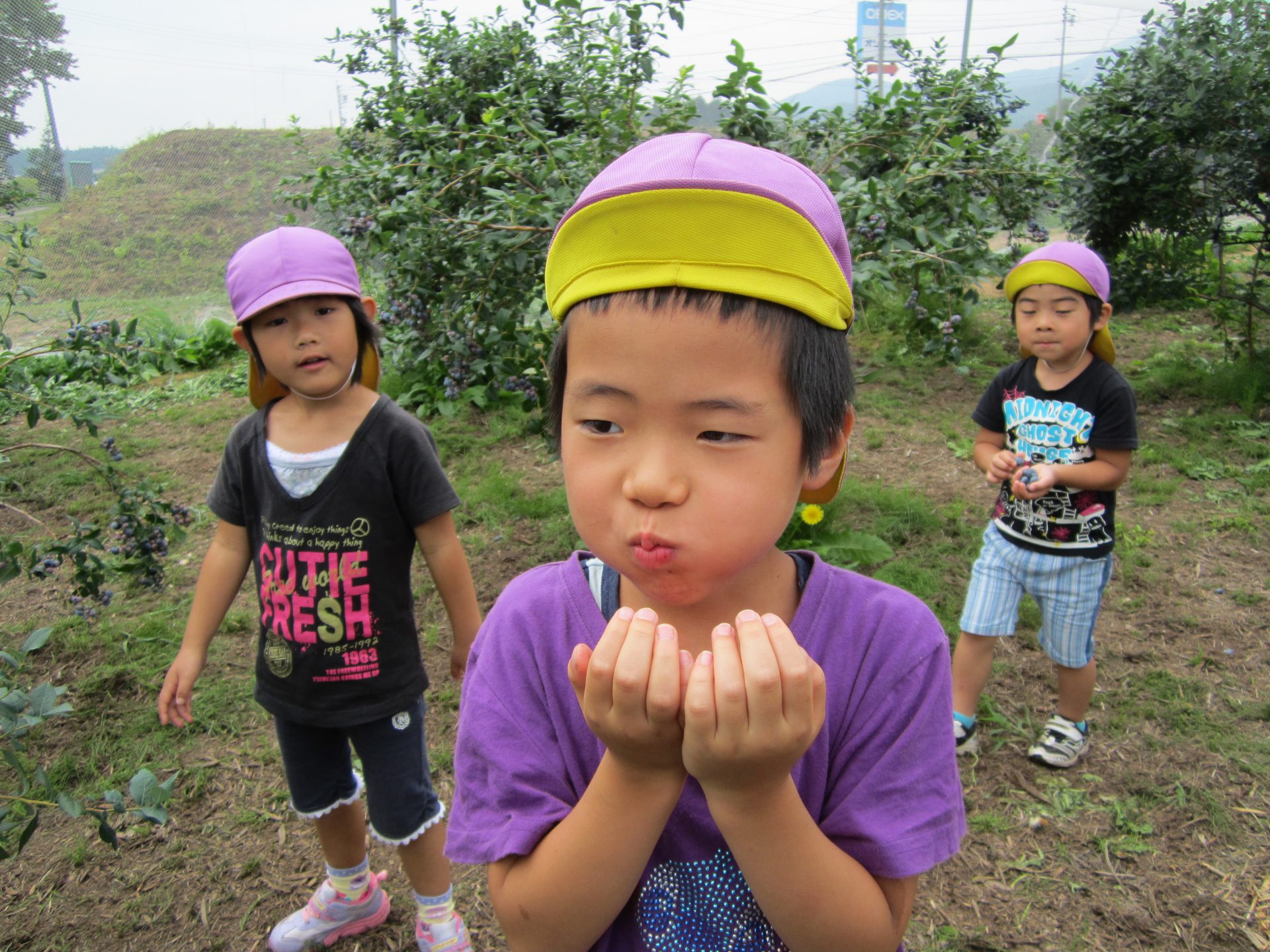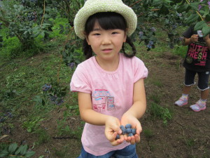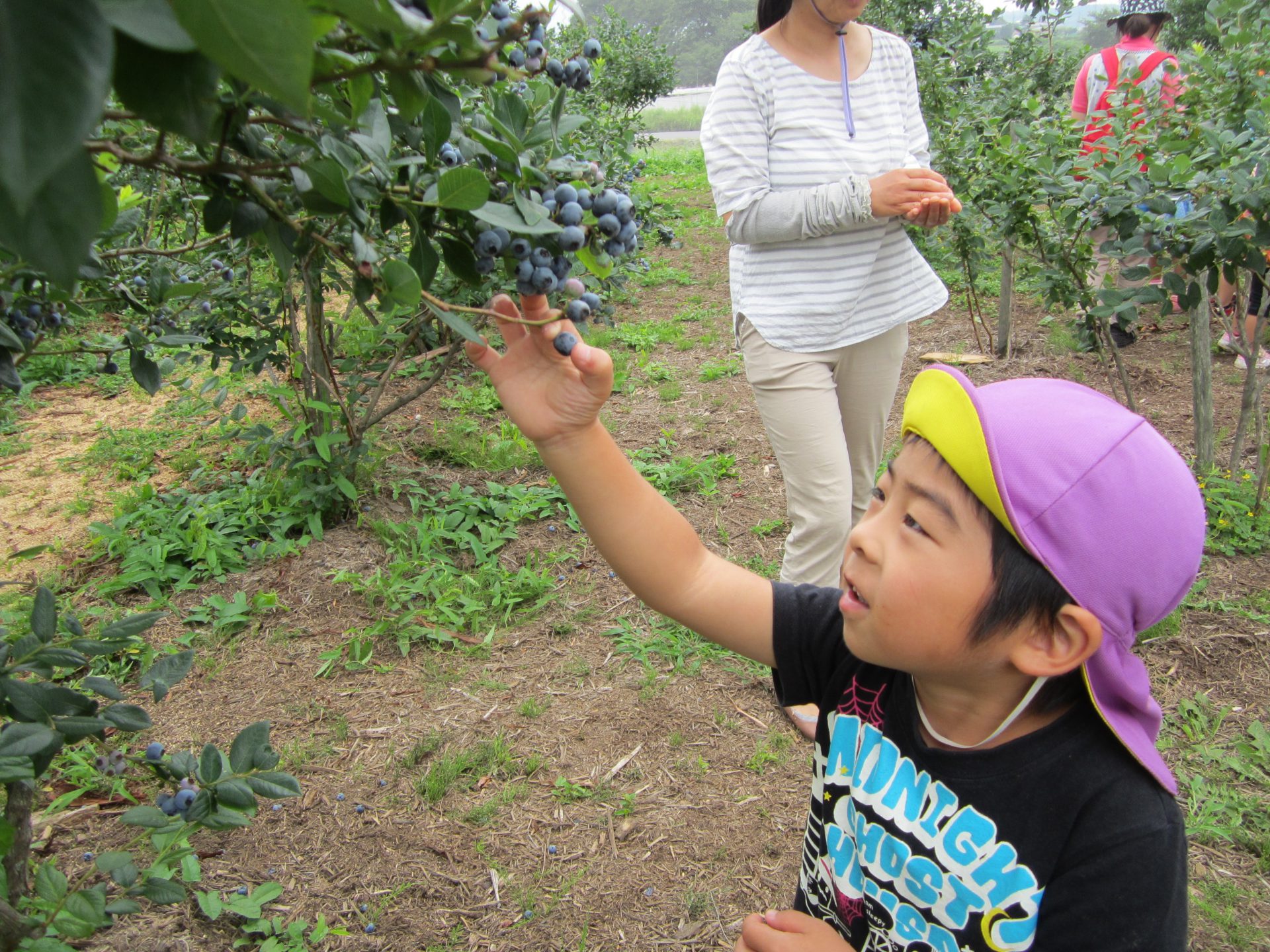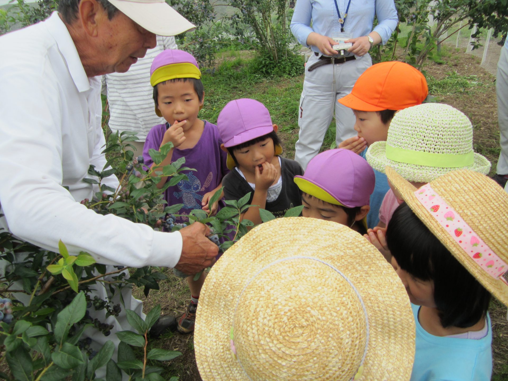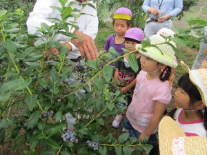 信濃町ブルーベリー栽培研究会にご招待いただき、富士里地区のKAWASUNブルーベリー農園さんに年長児が行ってきました。今年は富士里保育園のお友達と一緒にブルーベリーの摘み取り体験をさせてもらいました。