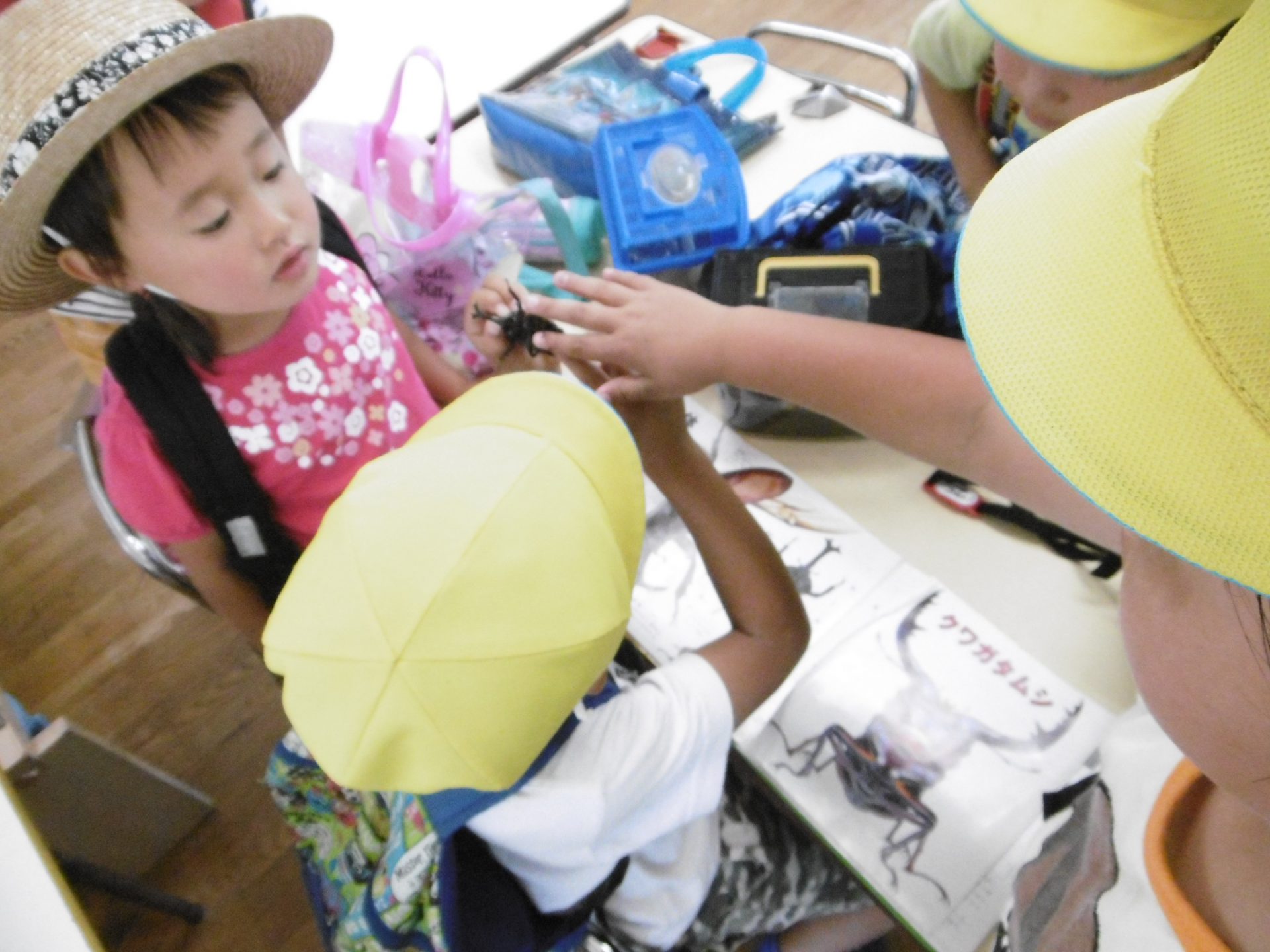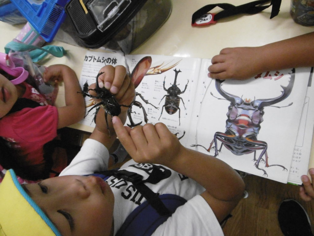 自宅から持ってきたカブトムシを実際に手で持って図鑑と照らし合わせて研究していました。