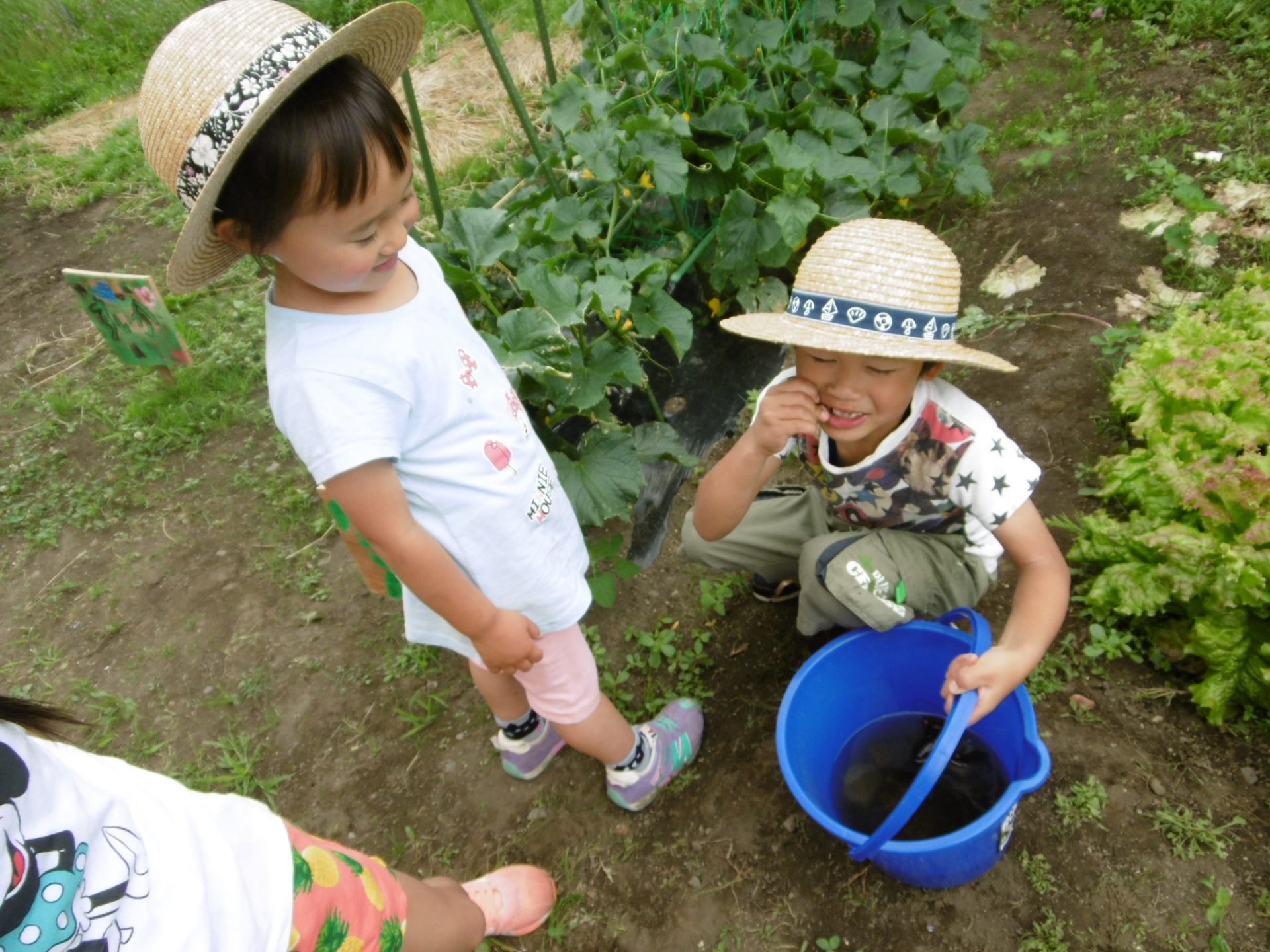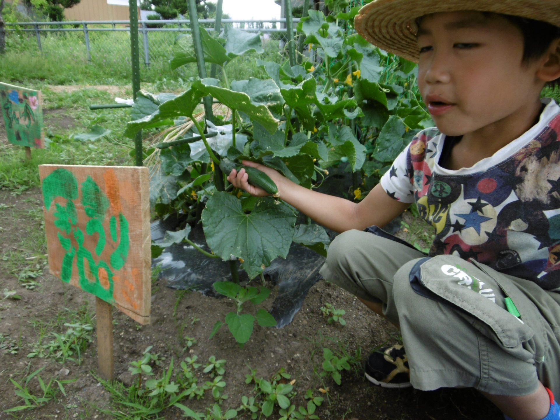 すると「なにそれ?」と、興味津々のA君。丁度畑のきゅうりを発見してみんなに知らせていたところ。