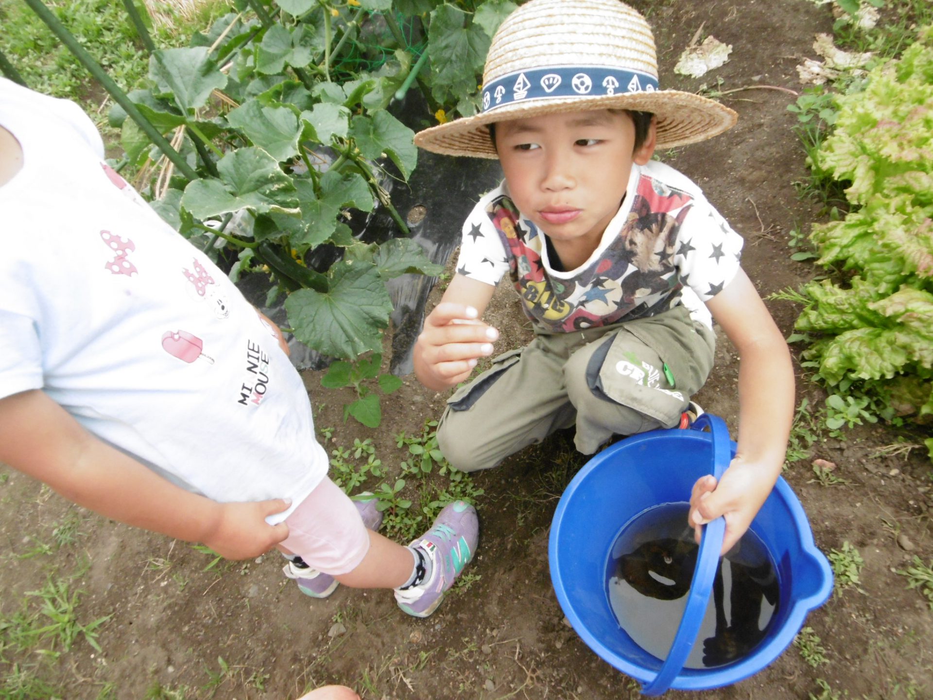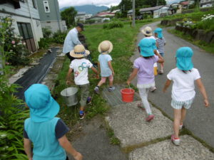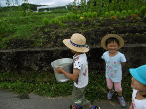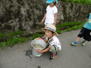 「水道のお水だと死んじゃうから田んぼのお水とってこよう!」とみんなで一致。さあ、いざバケツを手にして近くの田んぼへ。