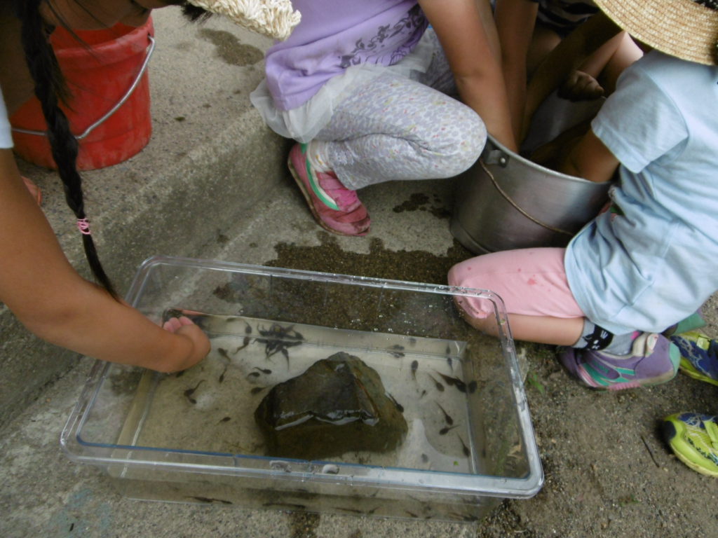 色々な話し合いのもと、おたまじゃくしを手で捕まえて移動させることに。