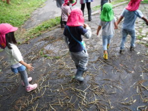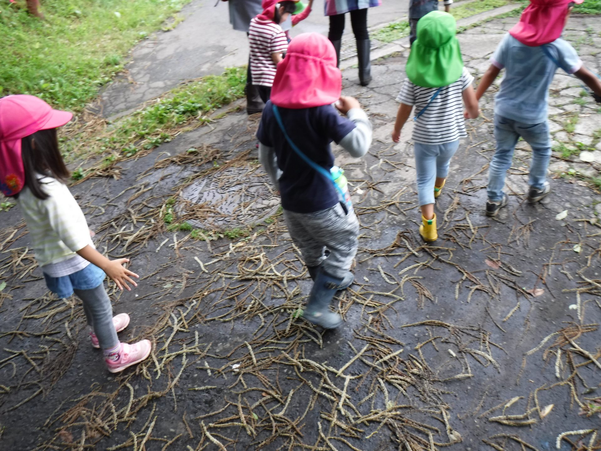 毛虫?いえ栗の花をずんずん踏んでいきます。