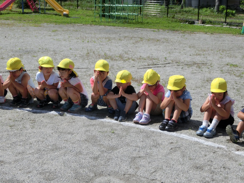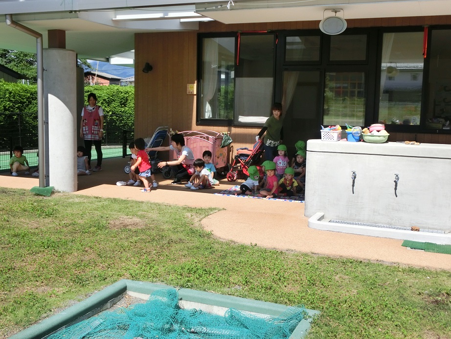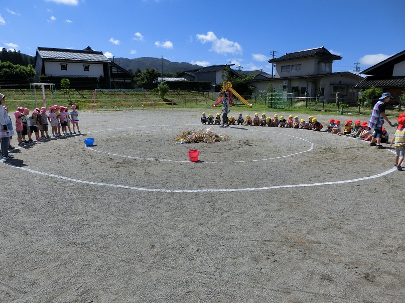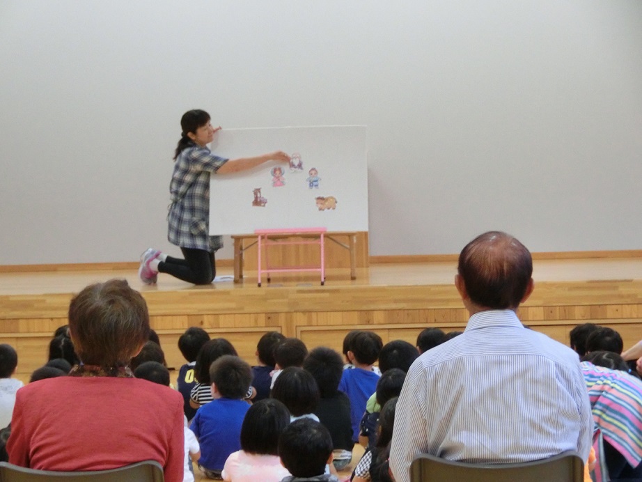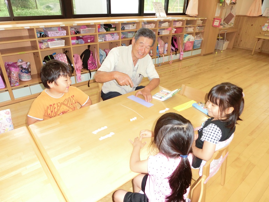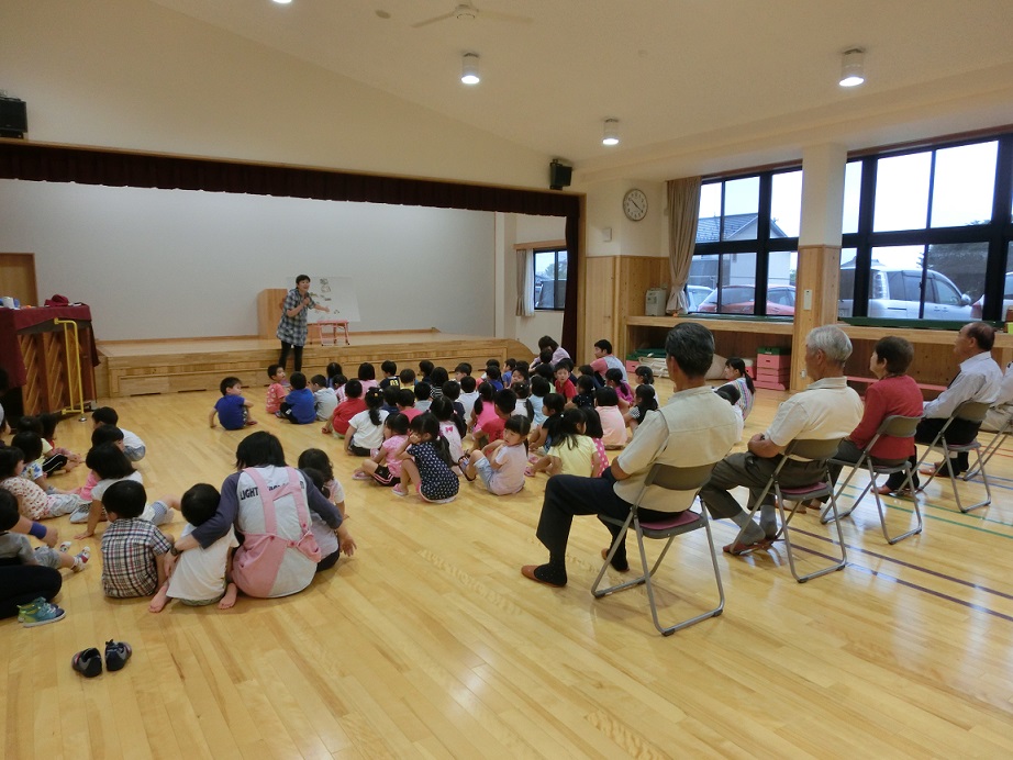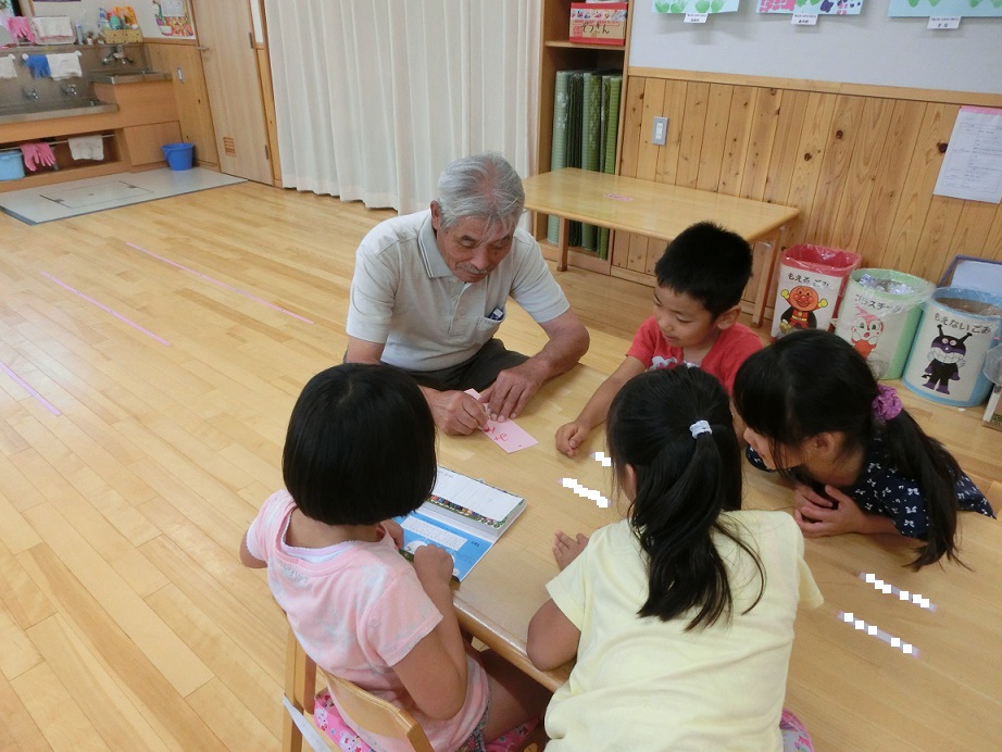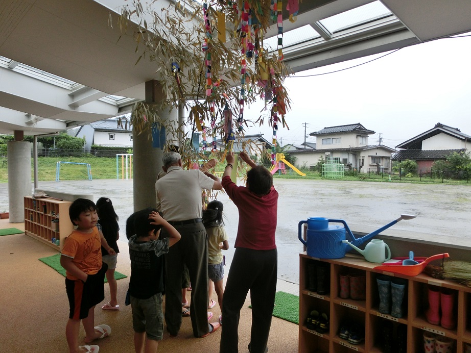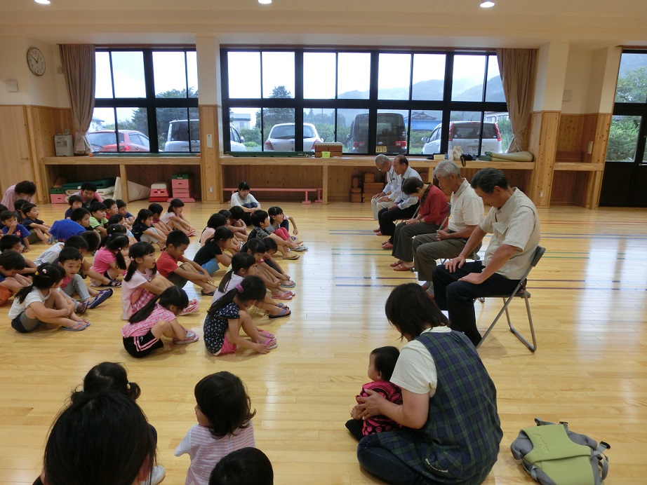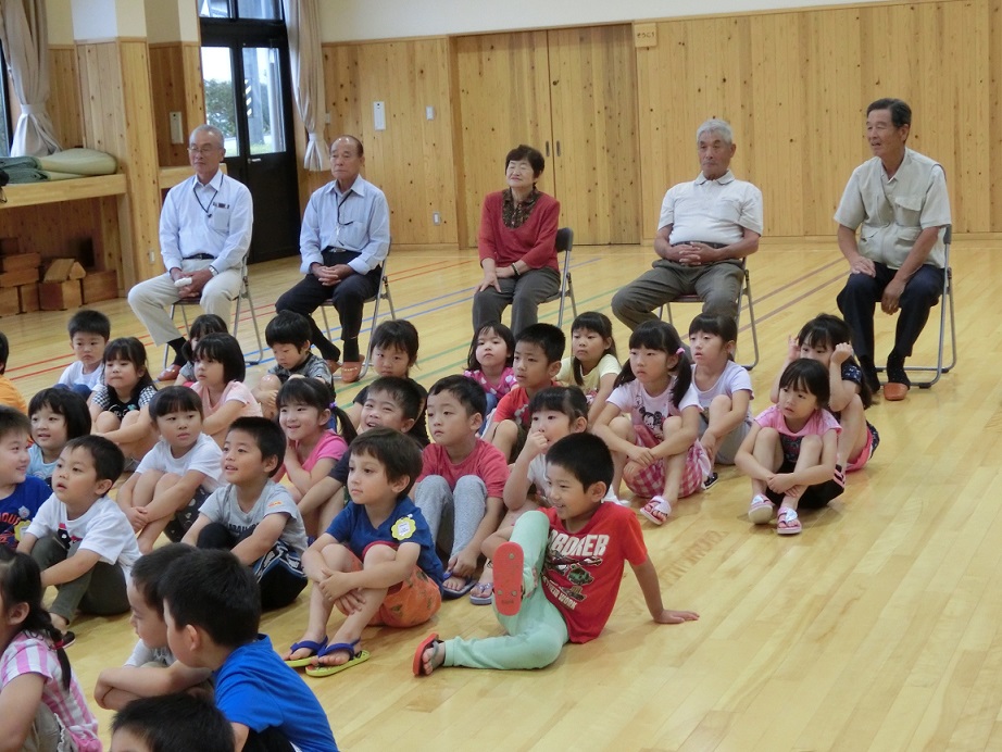 東みのわ保育園では7月6日(金)に地元の長寿クラブの皆様に来ていただいて七夕集会をしました。「お願いします」の挨拶です。