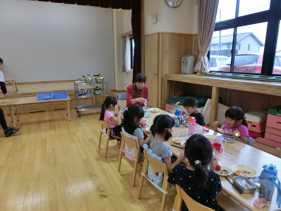 その後は園児が楽しみにしていた会食です。遊戯室で年少・年中・年長と一緒に昼食をとっていただきました。