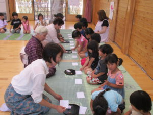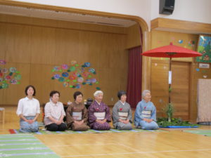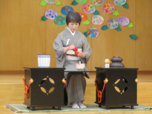 地域のお茶の先生が来てくださり、お茶の席を作ってくれました。お着物が素敵です。