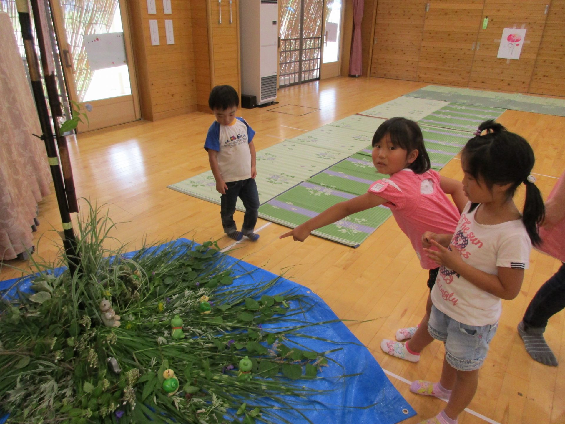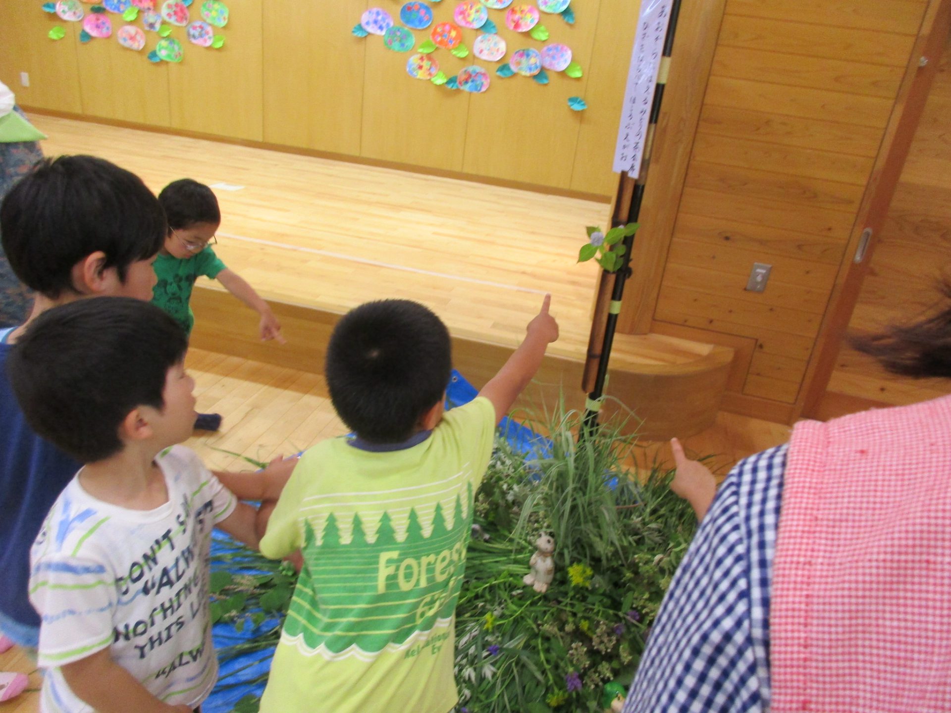 茶席の傘につゆ草を見つけ「青い花が咲いてる!」よもぎやたかのはすすきを見て