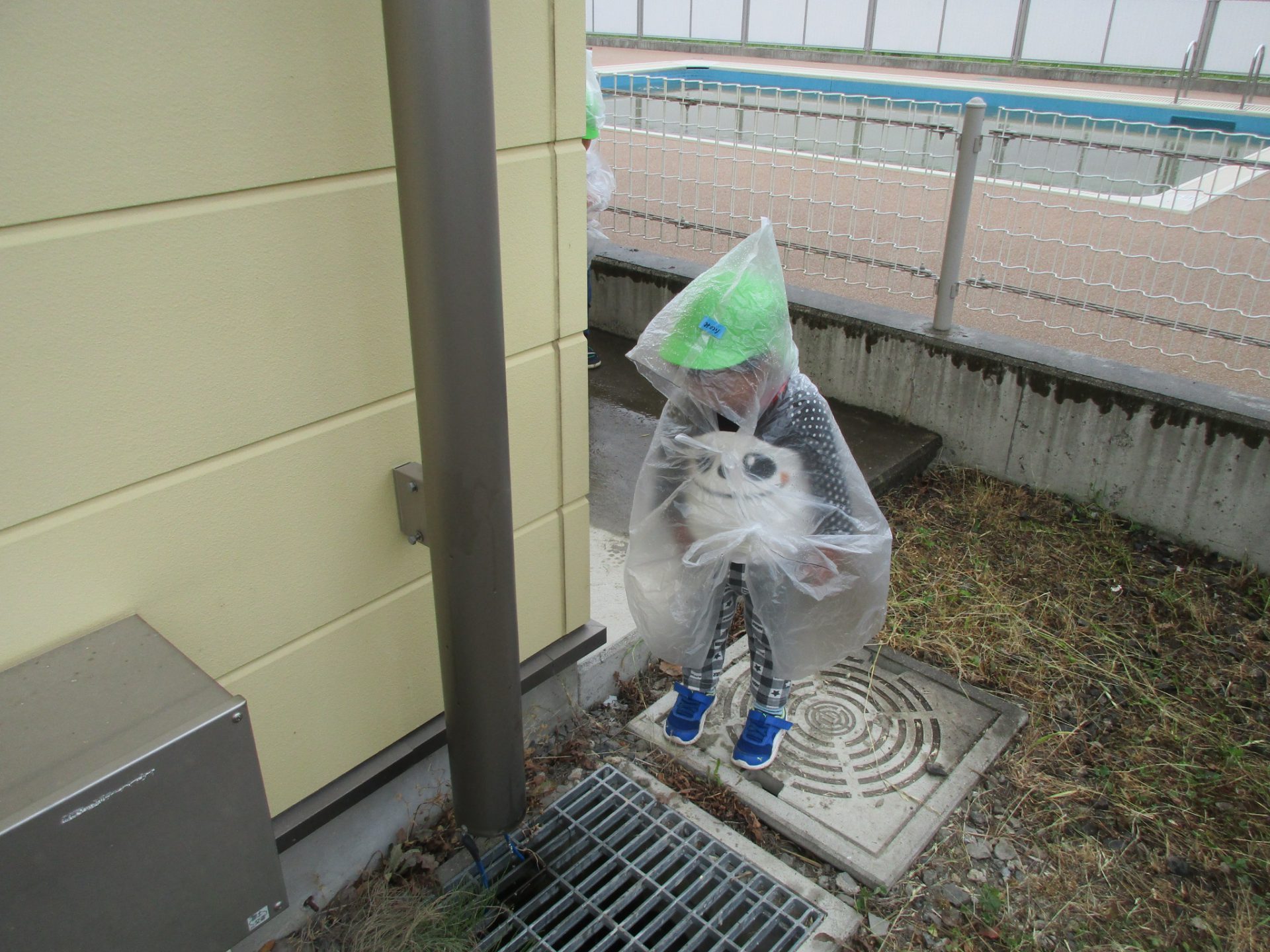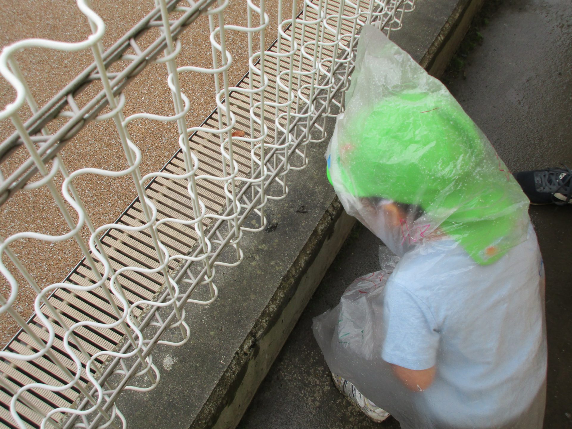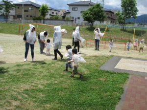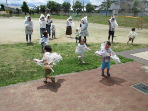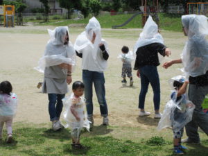 雨が降る時期もお外に出たい子ども達の気持ちを考え、雨と仲良しになれればと、参観日に協力してもらいカッパ作りを企画した。