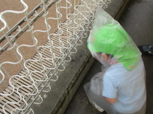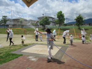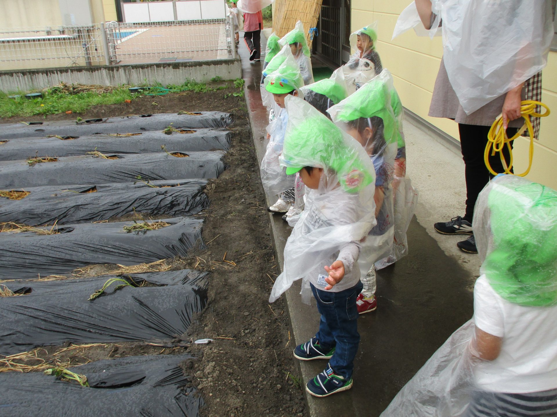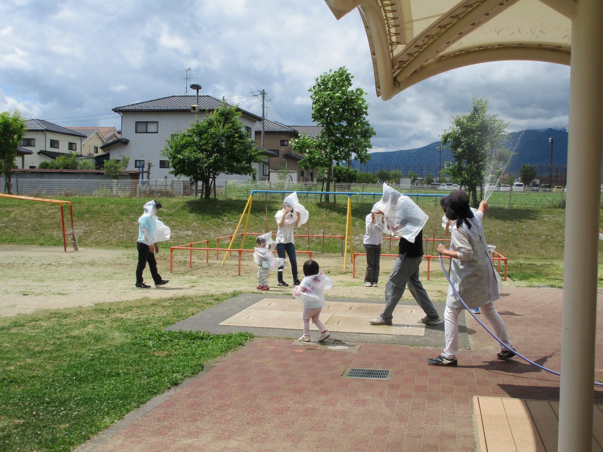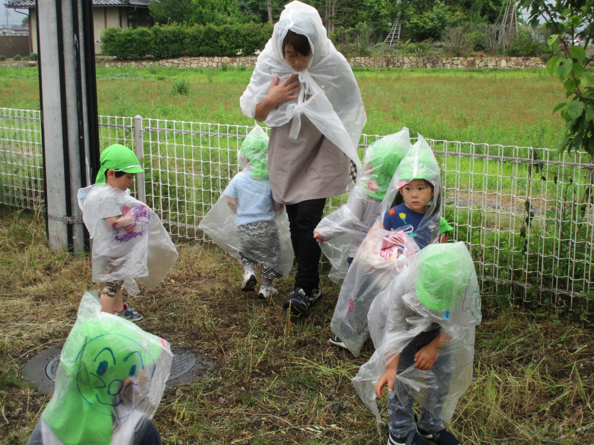 雨が降る時期もお外に出たい子ども達の気持ちを考え、雨と仲良しになれればと、参観日に協力してもらいカッパ作りを企画した。