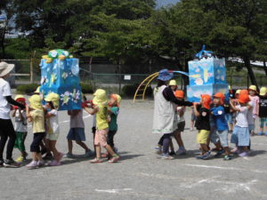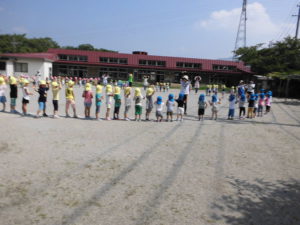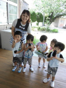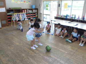 年中さんは収穫したスイカで《スイカ割りごっこ》を楽しんで遊んでから、美味しくいただきました♪
