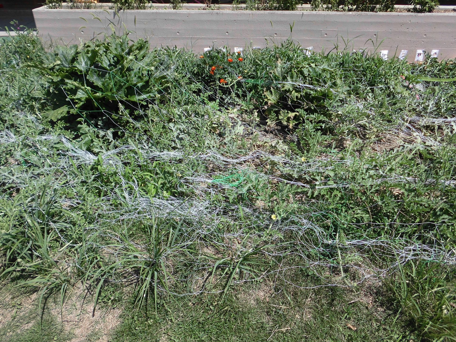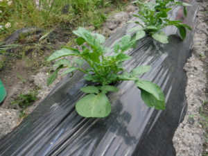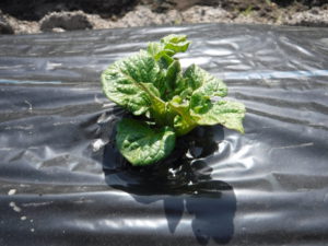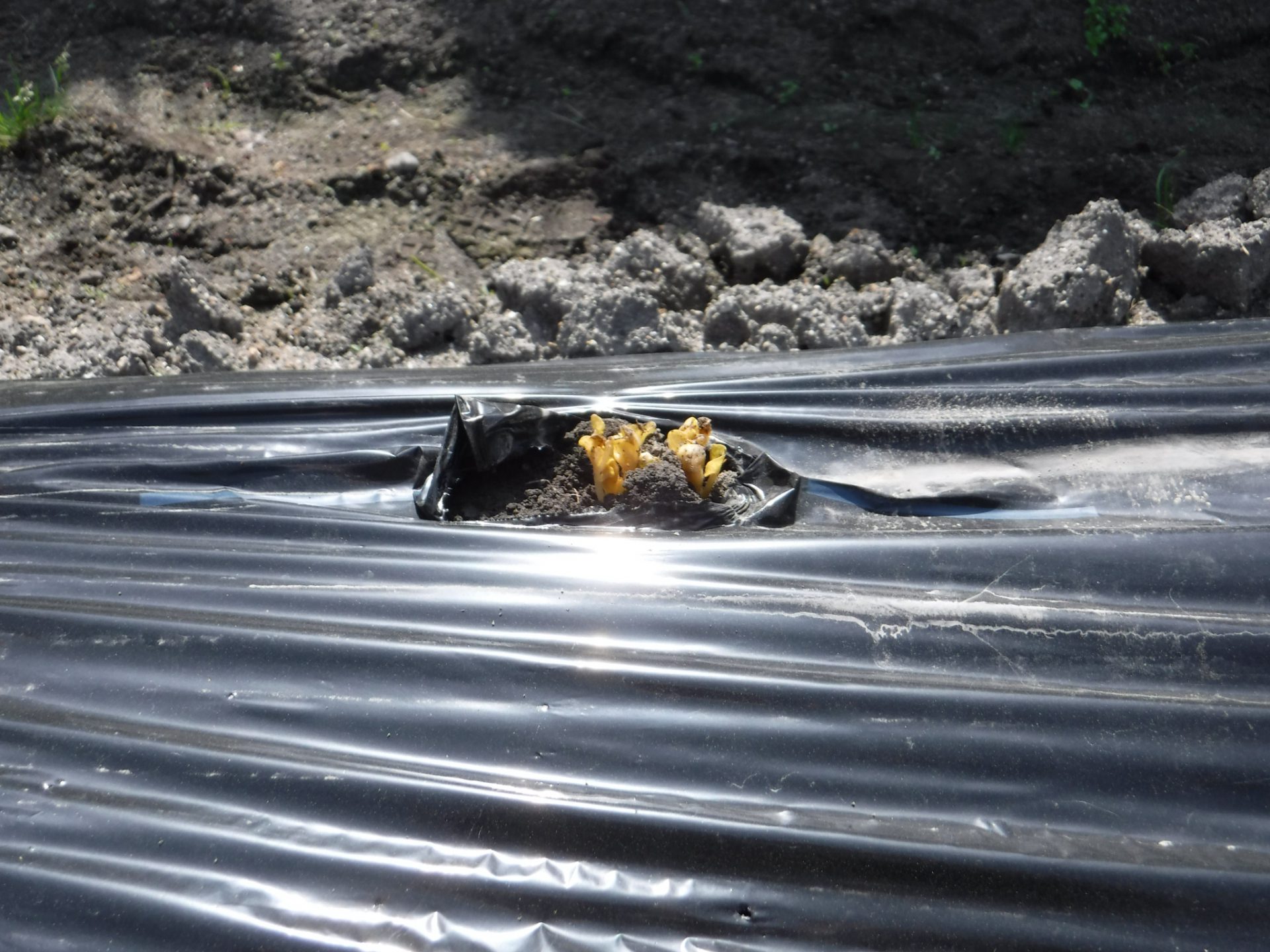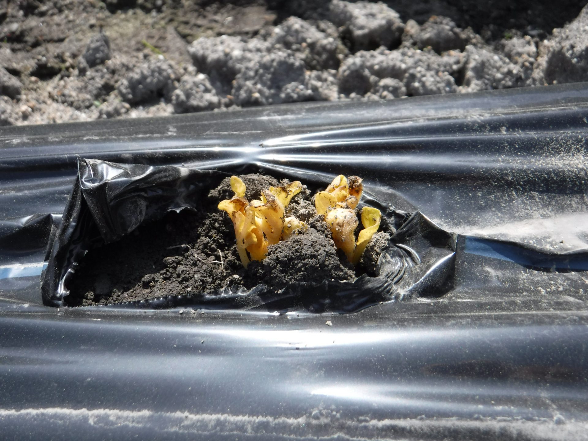 マルチの中で育っていた《芽》マルチに穴を開けてみると、《黄色い》芽が・・・(?!)